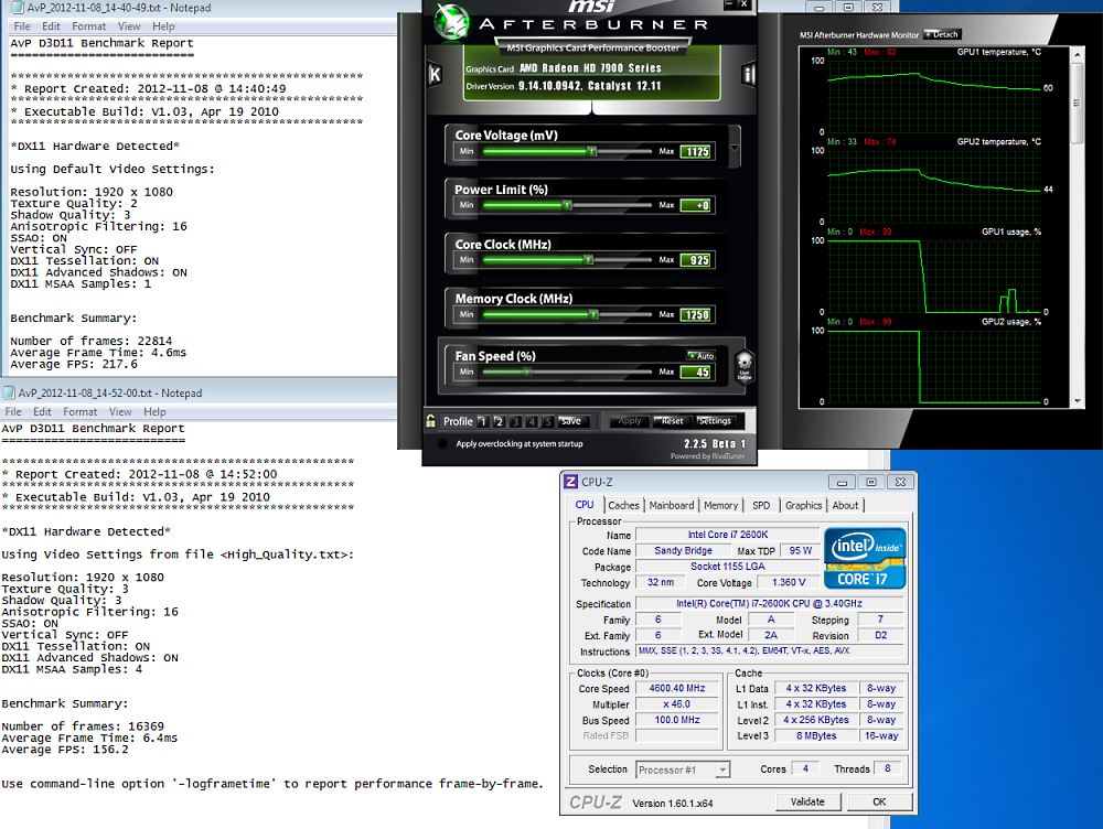 The_Blade Δημοσιεύτηκε Νοέμβριος 12, 2012 #1 Δημοσιεύτηκε Νοέμβριος 12, 2012 (edited) Σας παρουσιάζω ένα συνοπτικό Review των επιδόσεων της 7950 Sapphire Boost Edition (11196-16-20G), τόσο σαν single card όσο και σαν Crossfire. ΧΡΟΝΙΣΜΟΣ ΚΑΡΤΩΝ Φυσικά επειδή είμαστε στο thelab.gr οι κάρτες είναι Οverclocked. Επέλεξα να μην υπερβώ το στοκ voltage το οποίο είναι 1.25 under load για όλες τις Boost edition. Τα μέγιστα σταθερά ρολόγια που πέτυχα στους 2 πυρήνες ήταν 1200 και 1150 αντίστοιχα, το stability testing έγινε με furmark, evga o/c scanner και occt + BF3. Τις μνήμες τις άφησα στο 1575 γιατί δεν ήθελα να ρισκάρω την εμφάνιση του error correction και για να μην χρειαστεί επιπλέον εργαλείο για το o/c, όλες οι ρυθμίσεις είναι μέσω CCC και το afterburner μόνο για monitoring. Το Power Limit το έθεσα στο +20%. Έτσι τα Single Card tests έγιναν με 1200/1575 + 20% Power Limit και τα Crossfire με 1150/1575 + 20% και στις 2 κάρτες. TEST SYSTEM 2600k@ 4.6 Ghz (onboard GPU Disabled), 8 GB Ram@ 1866, GTS 450 PPU (Hybrid PhysX) H GTS 450 ως γνωστόν δεν βοηθάει σε κανένα από τα benches (3dMark11 δεν υποστηρίζει Nvidia PhysX) πέραν του Bonus τεστ που έκανα με το Fluidmark. DRIVERS SINGLE 7950: 12.11 Beta4, Catalyst Profiles: NONE CROSSFIRE 7950: 12.11 Beta6, Catalyst Profiles: NONE ΜΕΡΟΣ Α: SINGLE 7950 @ 1200/1575 3DMARK11 PERFORMANCE 3DMARK11 EXTREME HEAVEN 3.0 EXTREME CRYSIS CRYSIS WARHEAD STALKER CALL OF PRIPYAT LOST PLANET BENCH A LOST PLANET BENCH B SNIPER ELITE AVP NORMAL & HIGH SETTINGS METRO 2033 SLEEPING DOGS BF3 TV TOWER SCREENSHOT HYBRID PHYSX TEST SINGLE 7950 @ 1200/1575 PPU: GTS 450 @ 783/800(DDR3) ΣΥΝΟΛΙΚΟΣ ΠΙΝΑΚΑΣ SINGLE 7950 @12000/1575 ΜΕΡΟΣ Β: 7950 CROSSFIRE @ 1150/1575 3DMARK11 PERFORMANCE 3DMARK11 EXTREME HEAVEN 3.0 EXTREME CRYSIS CRYSIS WARHEAD STALKER CALL OF PRIPYAT LOST PLANET BENCH A LOST PLANET BENCH B SNIPER ELITE AVP NORMAL & HIGH SETTINGS METRO 2033 SLEEPING DOGS BF3 TV TOWER SCREENSHOT ΣΥΝΟΛΙΚΟΣ ΠΙΝΑΚΑΣ CROSSFIRE 7950 @1150/1575 ΣΥΓΚΡΙΤΙΚΟΣ ΠΙΝΑΚΑΣ SINGLE 7950@ 1200/1575 VS 7950 CROSSFIRE @ 1150/1575 ΣΥΜΠΕΡΑΣΜΑΤΙΚΑ SINGLE Μία Overclocked 7950 μπορεί να καλύψει απόλυτα τις ανάγκες για Gaming @ 1920*1080 στα υψηλότερα δυνατά settings. Με μαθηματικό υπολογισμό στα 1150 MHz η διαφορά απόδοσης από τα 1200 είναι αμελητέα (περίπου -4,3% περίπου), ενώ και στα 1100 (που δύσκολα δεν θα πιάσει μια κάρτα) είναι πάλι μικρή (-8.6% περίπου). Δεν έκανα όλες τις μετρήσεις για να ελέγξω αυτά τα νούμερα αλλά από λίγα τεστ που έτρεξα επιβεβαιώθηκαν όσα υπολόγισα με πράξεις. CROSSFIRE Στα παλαιότερα Games το Crossfire δεν δουλεύει όπως θα έπρεπε, ίσως δεν έχει δοθεί η απαραίτητη προσοχή στους Drivers. Φυσικά τα Crysis είναι πλέον τίτλοι 4-5 ετών και το Stalker Call of Pripyat στηρίζεται σε μια παλιά μηχανή. Στην περίπτωση του Lost Planet η εικόνα είναι πολύ περίεργη, στο μεγάλο bench (Α) το Scaling και το Usage είναι εξαιρετικό ενώ στο μικρό (Β) δεν λειτουργεί όπως θα έπρεπε. Εκεί που το Crossfire δουλεύει, δηλαδή στα νέα παιχνίδια, τα αποτελέσματα είναι εντυπωσιακά. Λαμβάνοντας υπόψη ότι η Single 7950 έχει πλεονέκτημα 4.3% στον πυρήνα, αυτό σημαίνει ότι εκεί που βλέπουμε διαφορά κοντά στο 90% στην πραγματικότητα είναι κοντά στο 100%! Τέλος στο BF3 η σκηνή του TV TOWER έχει εμφανώς κάποιο πρόβλημα, αυτό γιατί ενώ γενικά οι κάρτες παίζουν στο 80-90% εκεί πέφτουν στο 50%. Σε γενικό gameplay BF3 η διαφορά είναι σημαντική από μία σε δύο κάρτες. Mε Crossfire στο BAZO , παίζω κατά κανόνα ανάμεσα στα 150 και 200 FPS, με κάτι πιο σπάνια 130αρια. Μιλάμε πάντα για 1920* όλα ultra MSAA 4x και χωρίς post process AA. Με μία κάρτα είμαι περίπου 60% κάτω κατά μέσο όρο και πάντα χοντρικά. _______________________________________________________________________________________________ (15/12/2012) Συμπλήρωμα: 7950 @ 1200/1575 Hitman Absolution Dirt 3 Crysis 2 ΣΥΝΟΛΙΚΟΣ ΠΙΝΑΚΑΣ SINGLE 7950 @1200/1575 7950 CF @ 1150/1575 Hitman Absolution Dirt 3 Crysis 2 ΣΥΝΟΛΙΚΟΣ ΠΙΝΑΚΑΣ CROSSFIRE 7950 [MENTION=19909]1150[/MENTION]/1575 ΣΥΓΚΡΙΤΙΚΟΣ ΠΙΝΑΚΑΣ SINGLE 7950@ 1200/1575 VS 7950 CROSSFIRE @ 1150/1575 Έγινε επεξεργασία Δεκέμβριος 15, 2012 από TifoziF1