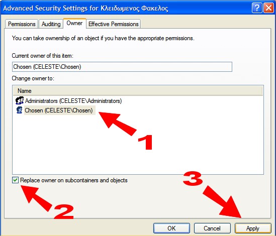 Chosen Οκτώβριος 18, 2004 #7 Οκτώβριος 18, 2004 Βημα 3: Κλικαρεις πρωτα μια φορα στον χρηστη σου, μετα τσεκαρεις το "Replace owner" και μετα "Apply". Αν αυτα δεν αρκουν, ξαναπας στο προηγουμενο tab (Security, πριν το "Advanced") και κλικαρεις στον χρηστη σου, κλικαρεις στο checkbox "Full control", "Apply" και εισια ετοιμος.