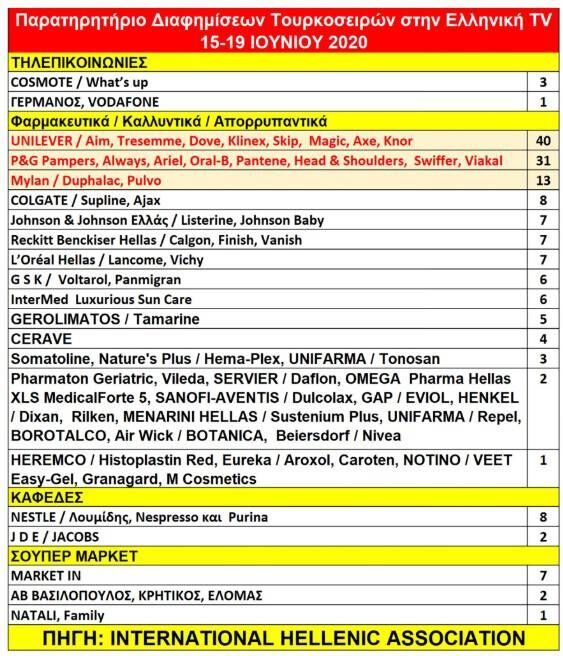 Την εβδομάδα 15-19 Ιουνίου 2020, παρ' όλο που η τηλεθέαση όλων των τουρκικών σειρών στην ελληνική τηλεόραση βυθίστηκε, εκατόν δέκα έξη εταιρίες, "χρηματοδότησαν" με την δαπάνη 425 περίπου διαφημιστικών μηνυμάτων τις προπαγανδιστικές, τουρκικές σειρές της ελληνικής τηλεόρασης. Από τις 116 εταιρίες, περισσότερες από τις μισές (62 επιχειρήσεις) "συμμετείχαν" με ένα ή δύο διαφημιστικά μηνύματα, ενώ μόνο πέντε επιχειρήσεις (οι "Χρυσοί Χορηγοί" της εβδομάδες) κάλυψαν το 28% περίπου των διαφημίσεων ολόκληρης της εβδομάδος.