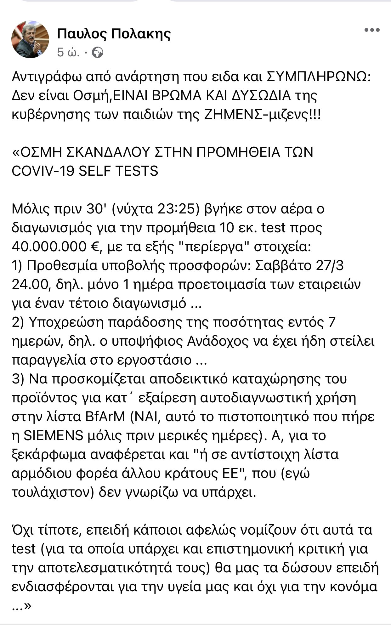 Με αφορμή το αρχικό σχόλιο του Γιάγκου: (δε νομίζω ότι ειρωνεύτηκε εσένα ο σούμι, για τον Πολάκη πήγαινε η ειρωνεία). Υπάρχει ένα γενικό πρόβλημα με την συμπεριφορά μας έναντι αυτής της εταιρείας.  Με ενοχλεί -γενικώς, δεν το γράφω μονάχα για το περιστατικό των self tests- ότι την έχουμε μετατρέψει σε ένα είδος «μαγικού όπλου» κι όποτε προκύπτει ένα ζήτημα, αρκεί να πετάξει οποιοσδήποτε την λέξη siemens κι αλλάζει όλη η συζήτηση. Χωρίς λογική, χωρίς κριτική σκέψη, χωρίς ουσία. Τελικά εις βάρος μας. Η siemens είναι τεράστια εταιρεία, σε πολλούς τομείς είναι σχεδόν αδύνατον να την αποφύγεις. Η κακώς εννούμενη δαιμονοποίηση δεν βοηθά, ούτε για να τιμωρήσουμε τις όποιες παρανομίες της ούτε για να βελτιώσουμε το δικό μας σύστημα προμηθειών όπου πάσχει. Ούτε για την πολιτική συζήτηση στα τεράστια προβλήματα της χώρας.