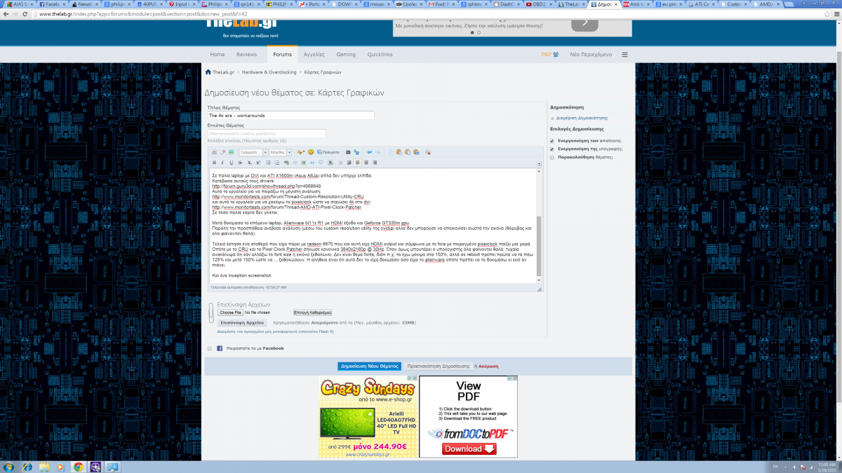 sotiris Δημοσιεύτηκε Ιανουάριος 28, 2015 #1 Δημοσιεύτηκε Ιανουάριος 28, 2015 Μόλις χθες έστησα τον πρώτο μου 4k capable υπολογιστή ώστε να δω πώς ακριβώς δουλεύει το πράγμα. Καταρχήν να πω ότι έχω για οθόνη μία Philips PUS6809 40 ULTRA HD, 479 ευρώ από crazy sundays τον Οκτώβριο (την είχα για τηλεόραση - πιθανώς να γυρίζει πάλι σε αυτό το ρόλο). Όλες οι UltraHD έχουν θεματάκι με το upscaling και δημιουργούν input lag, οπότε θέλει ψάξιμο ακόμη και για να παίξεις playstation στα 720p (μου πήρε λίγο καιρό να μάθω να τη σετάρω). Ξέροντας τώρα πώς να τη σετάρω ακριβώς, χρησιμοποιώ input που έχει προδιαγραφή για 30Hz στο 4K (καθότι έχει HDMI 1.4). Έχω ένα ποντίκι CM STORM devastator 2000dpi usb, στα 2000dpi η κατάσταση παλεύεται, αλλά τα 30Hz έχουν input lag. Αυτό είναι που ψάχνω να λύσω για να δω αν θα ξαναγυρίσει για τηλεόραση η συγκεκριμένη και να πάρω κάποια άλλη 4k 40άρα με HDMI 2.0 για οθόνη. Καταρχήν να πω ότι σε σχέση με τη dell 2405 που είχα πιο πριν, δεν υπάρχει επιστροφή. Είναι massive οι 40 ίντσες για οθόνη και το ppi είναι μεγαλύτερο της dell. Επίσης λόγω ultra slim design έχει κάτσει 10 πόντους πιο πίσω στο γραφείο, οπότε και κέρδισα αρκετό χώρο και απόσταση θέασης ώστε να μην είναι ελεεινά κουραστική. Έκανα αρκετές δοκιμές ώστε να βρω υπολογιστή να τη συνδέσω, καθότι τα laptop μου δεν υποστήριζαν 4K. Σε παλιό laptop με DVI και ATI X1600m (Asus A6Ja) απλά δεν υπήρχε ελπίδα. Κατέβασα αυτούς τους drivers: http://forum.guru3d.com/showthread.php?p=4988849 Αυτό το εργαλείο για να πειράξω τη μέγιστη ανάλυση: http://www.monitortests.com/forum/Thread-Custom-Resolution-Utility-CRU και αυτό το εργαλείο για να χακέψω το pixelclock ώστε να σηκώσει 4k στο dvi: http://www.monitortests.com/forum/Thread-AMD-ATI-Pixel-Clock-Patcher Σε τόσο παλιά κάρτα δεν γίνεται. Μετά δοκίμασα το επόμενο laptop, Alienware M11x R1 με HDMI έξοδο και Geforce GT335m gpu. Παρόλη την προσπάθεια ανέβασε ανάλυση (μέσω του custom resolution utility της nvidia) αλλά δεν μπορούσε να απεικονίσει σωστά την εικόνα (θόρυβος και όλα φαίνονταν θολά). Τελικά έστησα ένα σταθερό που είχα πάρει με radeon 6670 που και αυτή είχε HDMI output και σύμφωνα με τα fora με πειραγμένο pixelclock παίζει μια χαρά. Οπότε με το CRU και το Pixel Clock Patcher σήκωσε κανονικά 3840x2160p @ 30Hz. Όταν όμως μπουτάρει ο υπολογιστής όλα φαίνονται θολά, τυχαία ανακάλυψα ότι εάν αλλάξω το font size η εικόνα ξεθολώνει. Δεν είναι θέμα fonts, διότι π.χ. τα έχω μόνιμα στα 150%, αλλά σε reboot πρέπει πρώτα να τα πάω 125% και μετά 150% ώστε να ... ξεθολώσουν. Η αλήθεια είναι ότι αυτό δεν το είχα δοκιμάσει όσο είχα το alienware οπότε πρέπει να το δοκιμάσω κι εκεί αν πιάνει. Και ένα inception screenshot: