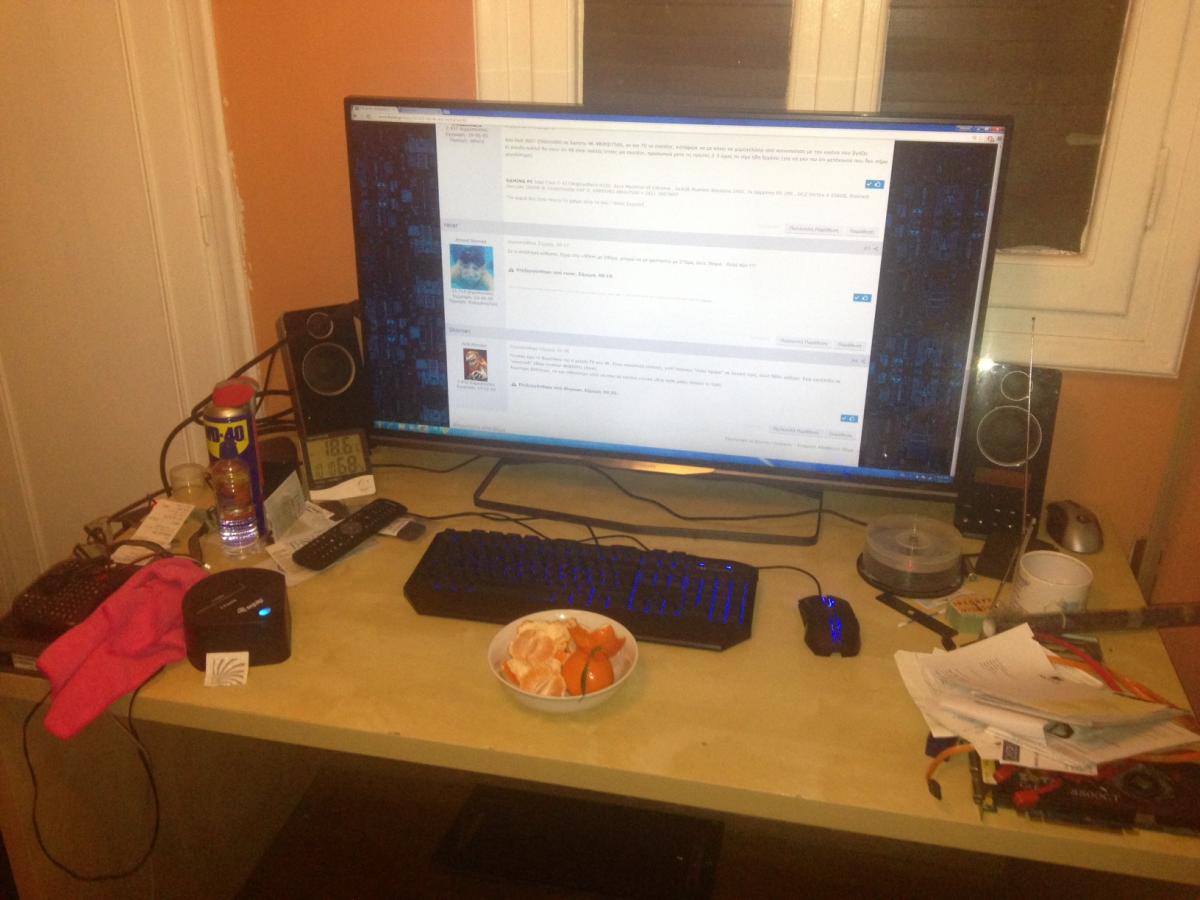 sotiris Ιανουάριος 29, 2015 Author #7 Ιανουάριος 29, 2015 Ε σε ένα τυπικό γραφείο φαίνεται έτσι: Ακόμη προσπαθώ να λύσω τα θεματάκια που έχω. Το βασικό είναι το font size. Στο 100% που δουλεύω στις νορμάλ οθόνες δεν βλέπω τίποτα (πολύ μικρά στη 40άρα). Στο 150% βλέπω αλλά δεν είμαι 100% ικανοποιημένος, θα ήθελα λίγο πιο μεγάλα τα μενού. Το ποντίκι έχει τρελό input lag. Όλοι λένε τα 30Hz αλλά εγώ δεν το πολυπιστεύω, το πρόβλημα είναι το input lag της οθόνης σε συνδυασμό με τα dpi. Μόλις τώρα διαπίστωσα ότι εάν βάλω την τηλεόραση πρώτα σε computer mode και μετά σε gaming mode έχει πολύ καλύτερο response (του στυλ από τα 300-400 input lag έχει πάει στα 50-100ms). Ακόμη κι έτσι όμως, 1000/30 μας κάνει 33.3 ms lag από τη θεωρία (30Hz) + ότι άλλο πρόσθετο input lag έχει το software της οθόνης πιστεύω έχει λίγο περιθώριο να πέσει. Δεν έχω δοκιμάσει και με καλά καλώδια να δω τι παίζει. Από κει και πέρα σκέφτομαι να πάρω ένα πολύ καλύτερο ποντίκι, συγκεκριμένα το steel series με τα 12000dpi να δω τι διαφορά θα μου κάνει σε σχέση με τα 2000dpi που δουλεύω τώρα. Έχω δουλέψει σε προ-tft οθόνες (DSTN) και ξέρω από καλό lag στο display