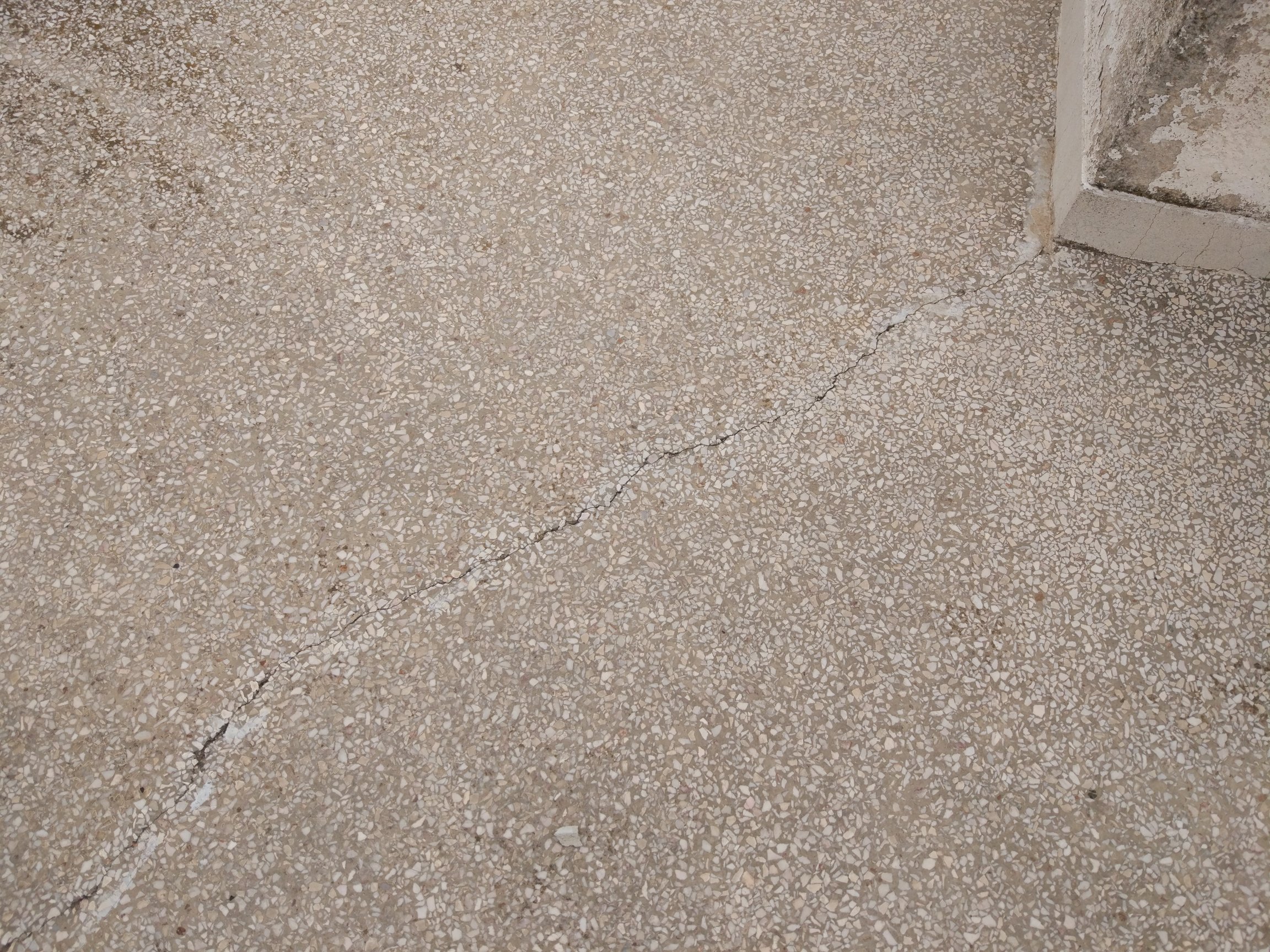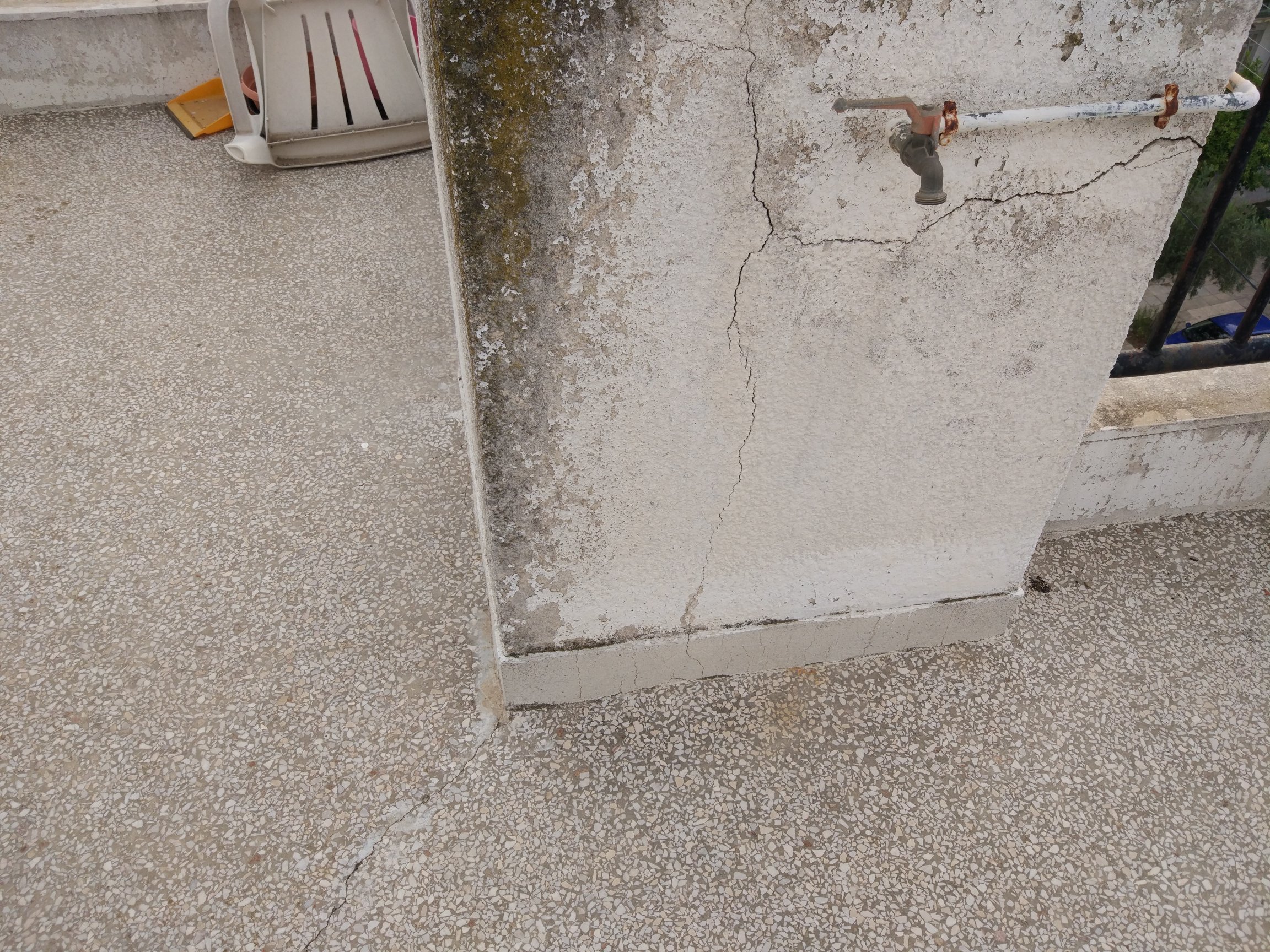 Αυτό το σκάσιμο πρέπει να το δει μηχανικός. Μπορεί να είναι απλώς σκασμένος σοβάς, μπορεί όμως και κάτι πιο σοβαρό.  Η ταράτσα χρειάζεται τσιμεντοκονία με κάποια πρόσμιξη ρητίνης. Το μωσαϊκό θα σκεπαστεί για πάντα.
