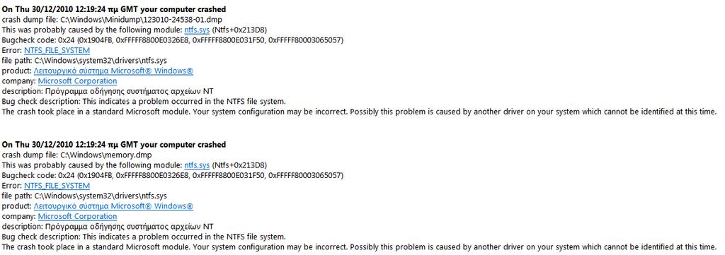 redgiwrgos Δεκέμβριος 30, 2010 #2 Δεκέμβριος 30, 2010 Πρώτη φορά βλέπεις μπλε οθόνη;;;Μπορεί να είναι άποιρα πράγματα όπως RAM, MOBO, drivers, GPU κτλ...τα πάντα μπορεί να το προκάλεσαν.Τι πείραξες πρόσφατα στο pc σου;The0x00000024 or0x24 error message will appear when there is a problem withNTFS.sys file.TheNTSF.sy s file only happens to be the driver file that allows the system to read and write to NTFSdrives. YOUR HARDDRIVE!!!The error message occurs when Windows XP encounters an unrecoverable error when it tries to accessan NTFS partition or a volume on the hard disk. Typically, you receive a Stop:0 x000000 24 errormessage during Windows XP Setup when one or more of the following conditions are true:• The file system or partition structure is corrupted. (Oops. That's not good.) • A driver compatibility issue exists. For example, the file system driver for an antivirus program or for other utility can cause this issue. (A lot better than the first.)από εδώ