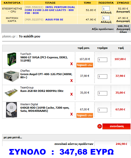 adpanos Αύγουστος 12, 2008 #23 Αύγουστος 12, 2008 CPU: AMD ATHLON X2 5200+ 2,6Ghzhttp://www.plaisio.gr/product.aspx?catalog=20&category=69977713&product=916080MOBO: ECS A780GM-Ahttp://www.plaisio.gr/product.aspx?catalog=20&category=69977721&product=1099965RAM: TEAMGROUP 2X1GB 800MHZhttp://www.plaisio.gr/product.aspx?catalog=20&category=69977727&product=964743H/D: SEAGATE 320GB SATA2http://www.plaisio.gr/product.aspx?catalog=20&category=69977741&product=857831GPU: CONNECT3D 4850 512MBhttp://www.plaisio.gr/product.aspx?catalog=20&category=69977735&product=1136089PSU: CHIEFTEC 500W http://www.plaisio.gr/product.aspx?catalog=20&category=69977705&product=873446 ----------------------------------------------------------------------------------------Συνολο: 389Ε!!!!