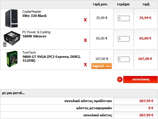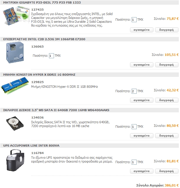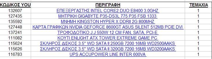 giorgos94 Αύγουστος 24, 2008 Author #7 Αύγουστος 24, 2008 Πως σας φενεται αυτο εδω το συστημα?ΕΠΕΞΕΡΓΑΣΤΗΣ INTEL CORE2 DUO E8200 2.66GHZ ΜΗΤΡΙΚΗ GIGABYTE P35-DS3L 775 P35 FSB 1333 ΜΝΗΜΗ KINGSTON HYPER X DDRII 2G 800MHZ ΜΝΗΜΗ KINGSTON HYPER X DDRII 1G 800MHZ ΚΑΡΤΑ ΓΡΑΦΙΚΩΝ NVIDIA 9600GT GALAXY 512MB DDR3 256BIT VO Chieftec*500W 24pinΚουτι Chieftec*Giga GH-01BW-OP BlackΣΚΛΗΡΟΣ ΔΙΣΚΟΣ 3.5'' WD SATA II 320GB 7200 16MB WD3200AAKS ΣΚΛΗΡΟΣ ΔΙΣΚΟΣ 3.5'' WD SATA II 320GB 7200 16MB WD3200AAKS UPS ACCUPOWER LINE INTER 600VAΕχω βρει και ενα κουτι το οποιο ειναι περιπου στα 30 ευρω και περιλαμβανει και ενατροφοδοτικο 450βατ. Αυτο το τροφοδοτικο θα το σηκωσει αυτο το συστημα; Αν ναιμηπως παρω αυτο ωστε να μειωσω περιπου 70-80 ευρω...Ευχαριστω