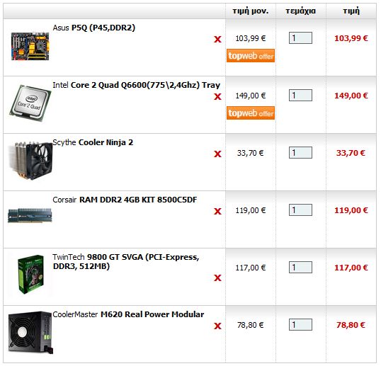 koutsoundad Δημοσιεύτηκε Σεπτέμβριος 8, 2008 #1 Δημοσιεύτηκε Σεπτέμβριος 8, 2008 την καλησπέρα μου, το νέο μου pc θα κάνει κυρίως επεξεργασία στο photoshop (ερασιτεχνικά) ενώ όπως πάντα θα δοκιμάζω διάφορες πλατφόρμες και νέα προγράμματα βαριά ή μικρά (όχι όμως πχ CAD). θεωρώντας ότι έχω όλα τα υπολοιπα, και ότι το budget που φαίνεται είναι στα επίπεδα που ήθελα (ενώ με παίρνει να το ανεβάσω 100-200e αλλά ΜΟΝΟ αν είναι απαραίτητο, θα ήθελα τη γνώμη σας για τα παρακάτω: -ξεκαθαρίζω ότι το pc δεν θα παίζει τπτ περισσότερο απο.. pacman ενώ απο OC απαιτήσεις θα ήθελα να το ανεβάσω μέχρι εκεί που δουλεύει σταθερότατα! με αέρα (3-3.2G?) -mobo: να πάρω το deluxe? η μόνη διαφορά που βλέπω είναι οι gameάδικες θύρες, έχει κάτι άλλο που πρακτικά το κάνει καλύτερης ποιότητας? υπάρχει κάποιο GB αντίστοιχο που προτείνετε? -η ψύκτρα είναι Ok? (κουτί Stacker830) -οι μνήμες θα ανέβουν ελαφρά, είναι ok? -η vga, εδώ τώρα.. ΔΕΝ θα παίζει αλλά θα χρειαστώ, λέει, την τεχνολογία CUDA για το νέο photoshop που θα βγει. σωστά? αυτό δεν είναι θέμα των drivers? ποιες vga μπορούν να το κάνουν? θα μπορούσε και μια απλή των 50e να δουλεύει για το photoshop με την όποια ισχύ έχει ή πρέπει να ναι κάποια καλή? -pls, προτείνετε- -το psu που διάλεξα είναι ok για όλα αυτά, +3-4 δίσκους, ανεμιστήρες κτλ? προτείνετε κάτι άλλο? για διάφορους άλλους λόγους θα πρέπει να έχω κάνει την αγορά στις επόμενες 2 μέρες, οπότε αν είχατε γρήγορη απάντηση θα την εκτιμούσα. ευχαριστώ παίδες, Β
