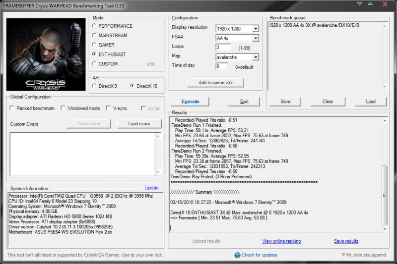 steve_m Μάρτιος 15, 2010 #51 Μάρτιος 15, 2010 Εγω παλι ειμαι της αποψης οτι αν παιζεις τα παιχνιδια σε full settings η gpu κανει ολη την δουλεια.Να και δυο εικονες απο το crysis warhead. Στην 1η ο q9550 στα defaults και η 2η στα 4ghz.Οι 2 5870 cf στα μαμα ρολογια.Το crysis/warhead ανηκει στην "εξωγηινη" κατηγορια.Οτι και να κανεις παλι δε θα φτανει για να δεις διαφορα.