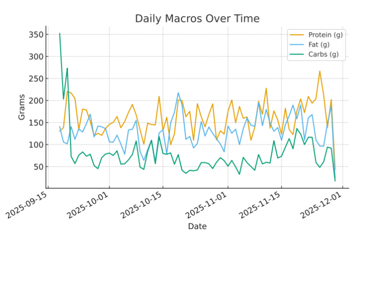 Το πιο χρήσιμο γράφημα που μου έδωσε η Πάολα είναι αυτό. Φαίνεται ότι από τα 250-350 carbs που έτρωγα κανονικά (προσέχοντας πάντα και με ισορροπημένη σχετικά διατροφή) έπεσα στα 50-100. Εκεί φαίνεται η συνέπεια αλλά και η διαφορά σε σχέση με μια διατροφή με μακαρόνια / ρύζι κλπ. στους υδατάνθρακες.