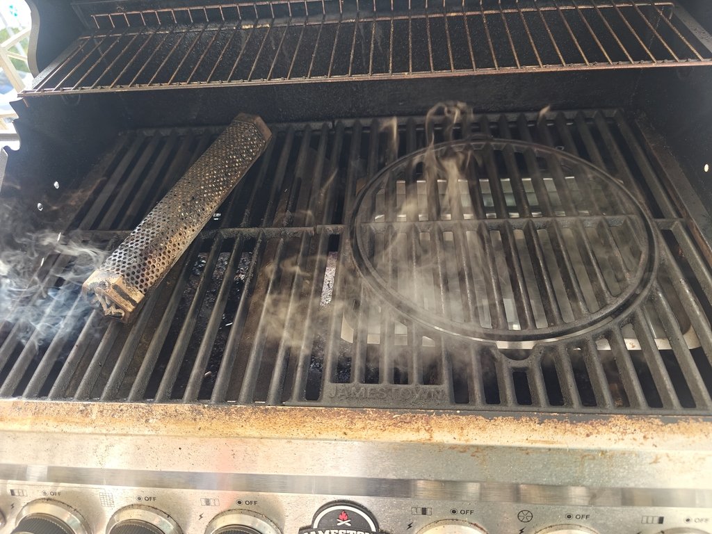 Σήμερα.... Μετά από 12 ώρες στο ψυγείο.... Κάπνισμα με pellet Hichory Ταψακι με ζεστό νερό κάτω από το κρέας για υγρασία -