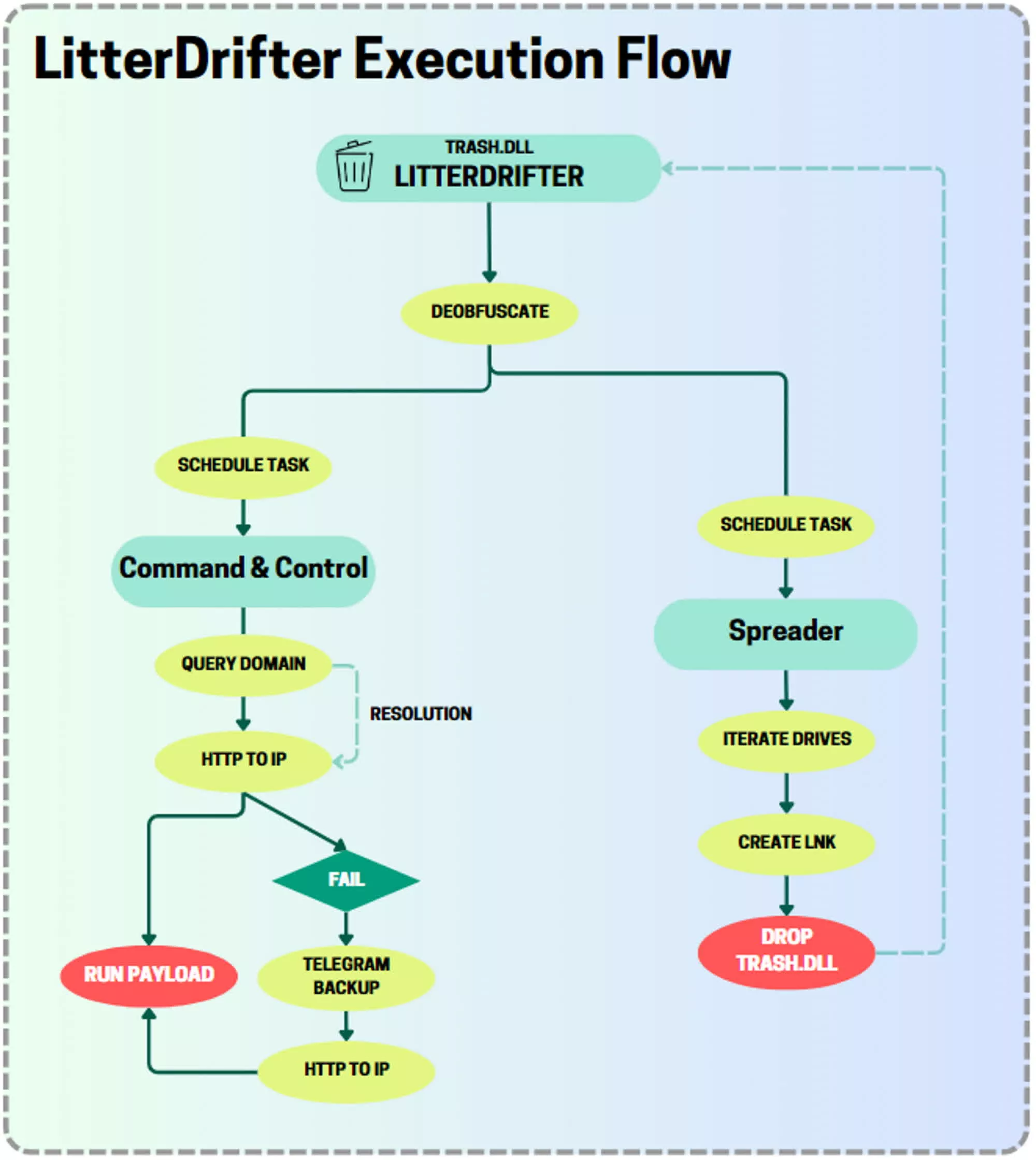 Το σκουλήκι προσπαθεί να μολύνει έναν στόχο USB μόλις η μονάδα flash συνδεθεί στο σύστημα. Μετά τη μόλυνση, το LitterDrifter προσπαθεί να επικοινωνήσει με έναν διακομιστή C2 που κρύβεται πίσω από ένα δίκτυο δυναμικών διευθύνσεων IP, οι οποίες συνήθως διαρκούν έως και 28 ώρες. Μόλις δημιουργηθεί μια σύνδεση, το LitterDrifter μπορεί να κατεβάσει πρόσθετα ωφέλιμα φορτία, να τα αποκωδικοποιήσει και τελικά να τα εκτελέσει σε ένα μολυσμένο σύστημα.