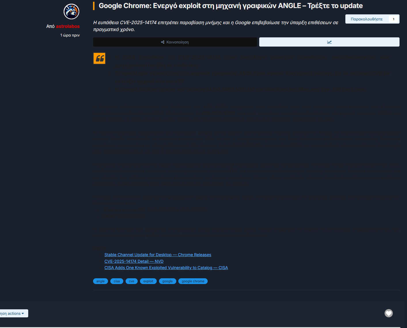 Η Υπηρεσία Κυβερνοασφάλειας και Υποδομών των ΗΠΑ (CISA) προχώρησε στην προσθήκη μιας νέας ευπάθειας στον κατάλογο των Γνωστών Εκμεταλλεύσιμων Ευπαθειών (KEV). Πρόκειται για το CVE-2025-14174, ένα κενό ασφαλείας «υψηλής σοβαρότητας» στη μηχανή γραφικών ANGLE του Google Chrome, το οποίο, σύμφωνα με την Google, έχει ήδη χρησιμοποιηθεί σε στοχευμένες επιθέσεις (exploited in the wild).