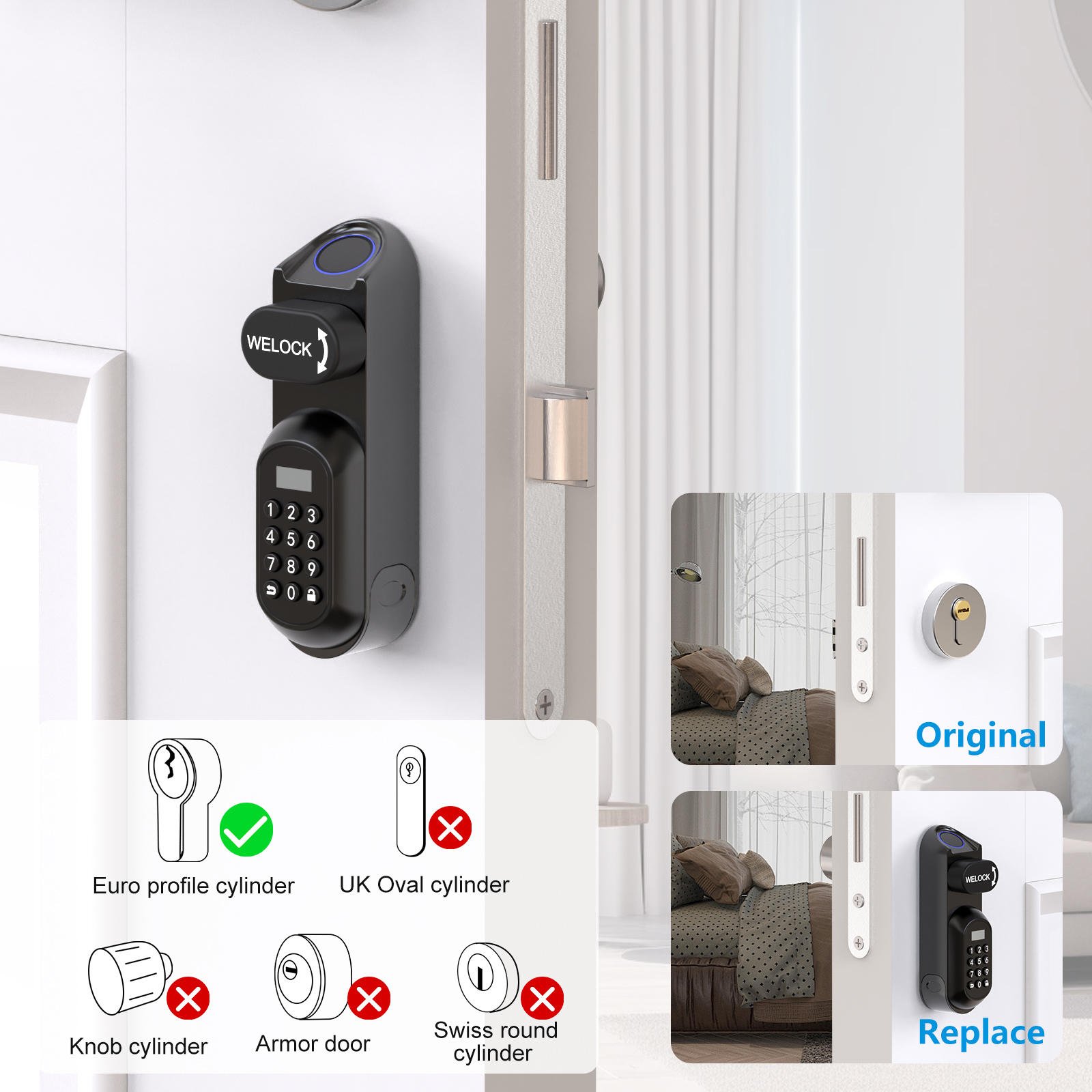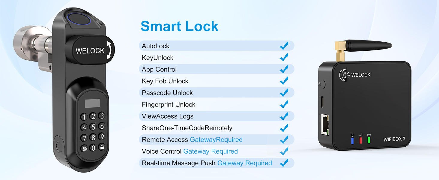 Η WELOCK smart lock U81 προσφέρει έξι επιλογές πρόσβασης: αποτύπωμα, PIN, RFID κάρτα, Bluetooth μέσω εφαρμογής, μηχανικό κλειδί, καθώς και φωνητική εντολή Alexa (με WiFi Gateway). Μπορείτε να ορίσετε προσωρινή ή μόνιμη πρόσβαση — ιδανικό για Airbnb ή ενοικιαζόμενα.