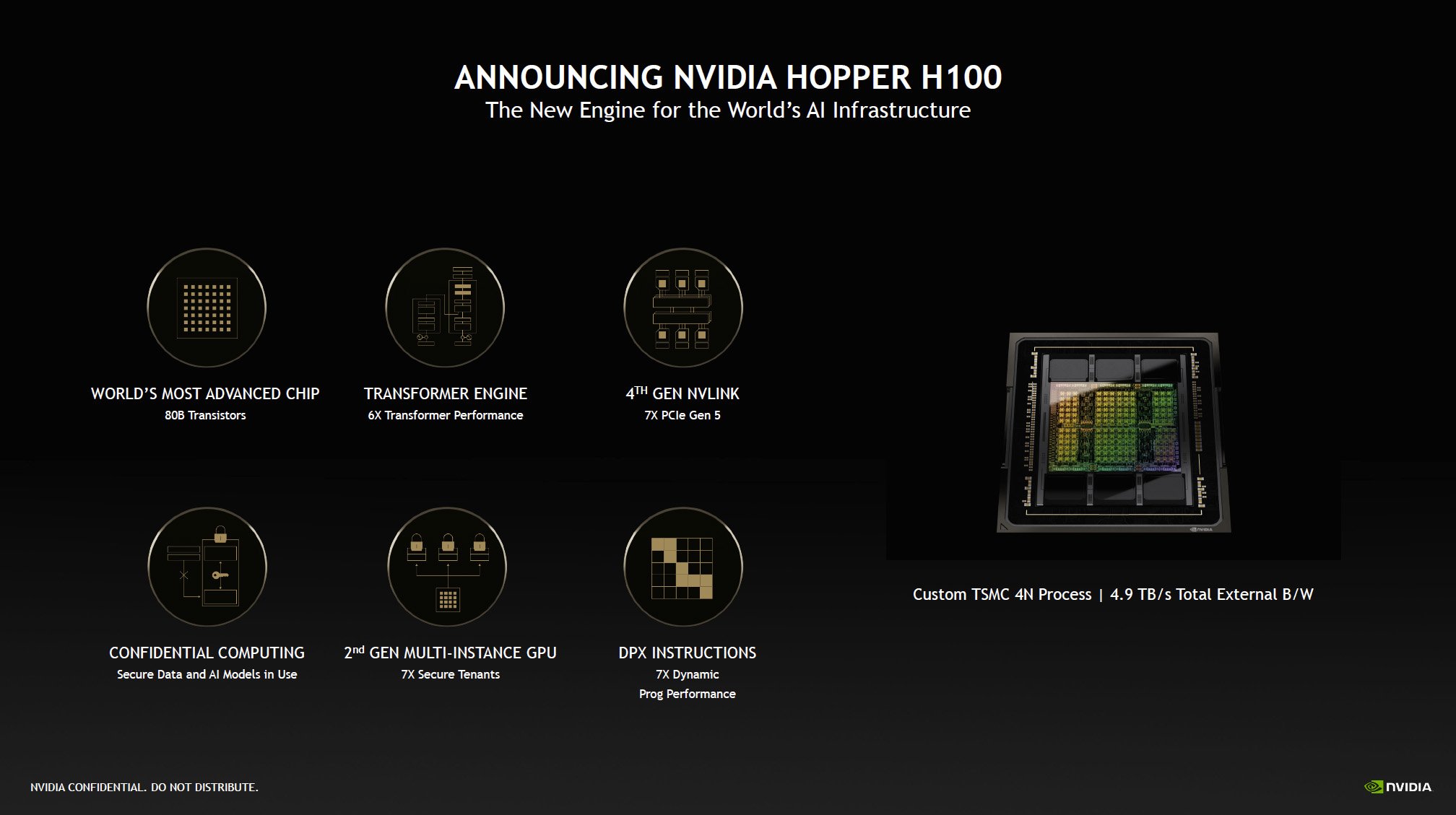 Η πρώτη κάρτα στη σειρά Hopper είναι η H100, που περιέχει 80 δισεκατομμύρια τρανζίστορ και ένα εξάρτημα που ονομάζεται Transformer Engine που έχει σχεδιαστεί για να επιταχύνει συγκεκριμένες κατηγορίες μοντέλων τεχνητής νοημοσύνης. Ένα άλλο αρχιτεκτονικό χαρακτηριστικό περιλαμβάνει την τεχνολογία MIG της Nvidia, η οποία επιτρέπει σε μια H100 να χωριστεί σε επτά μικρότερες, μεμονωμένες περιπτώσεις για να χειριστεί διαφορετικούς τύπους εργασιών. "Τα κέντρα δεδομένων γίνονται εργοστάσια τεχνητής νοημοσύνης -- επεξεργάζονται και βελτιώνουν μεγάλες ποσότητες δεδομένων για να παράγουν νοημοσύνη", δήλωσε ο ιδρυτής και διευθύνων σύμβουλος της Nvidia, Jensen Huang σε δελτίο τύπου. «Η Nvidia H100 είναι ο κινητήρας της παγκόσμιας υποδομής τεχνητής νοημοσύνης που χρησιμοποιούν οι επιχειρήσεις για να επιταχύνουν τις δραστηριότητές τους που βασίζονται στην τεχνητή νοημοσύνη».
