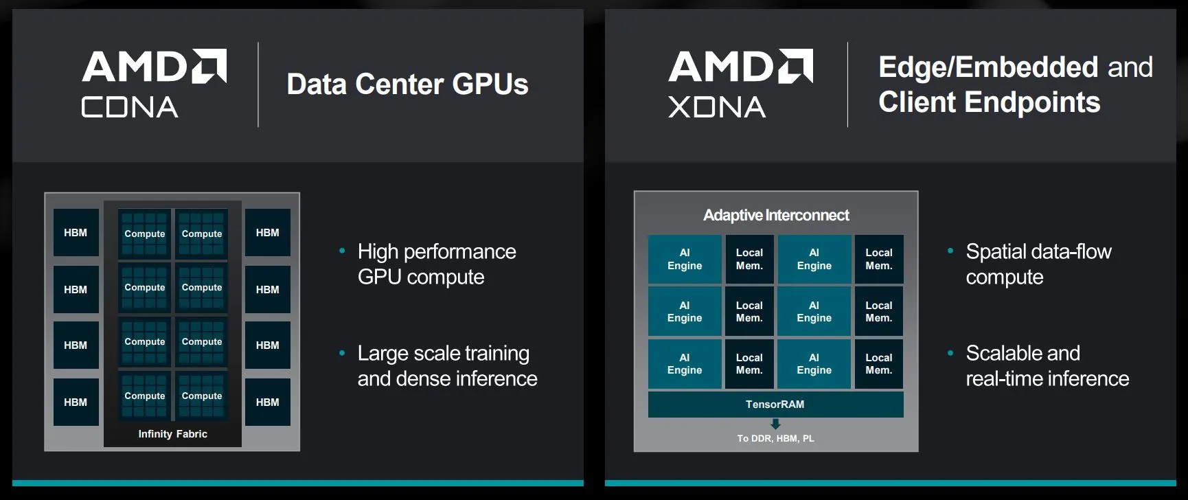 Οι στοίβες λογισμικού της AMD για κάθε κατηγορία προϊόντων είναι ξεχωριστές: Το ROCm (συντομογραφία για την πλατφόρμα Radeon Open Compute) στοχεύει στις σειρές GPU Instinct για κέντρα δεδομένων (και, σύντομα, στις καταναλωτικές GPU Radeon), το Vitis AI στοχεύει στις FPGA της και το ZenDNN στοχεύει στις συσκευές-πελάτες της.