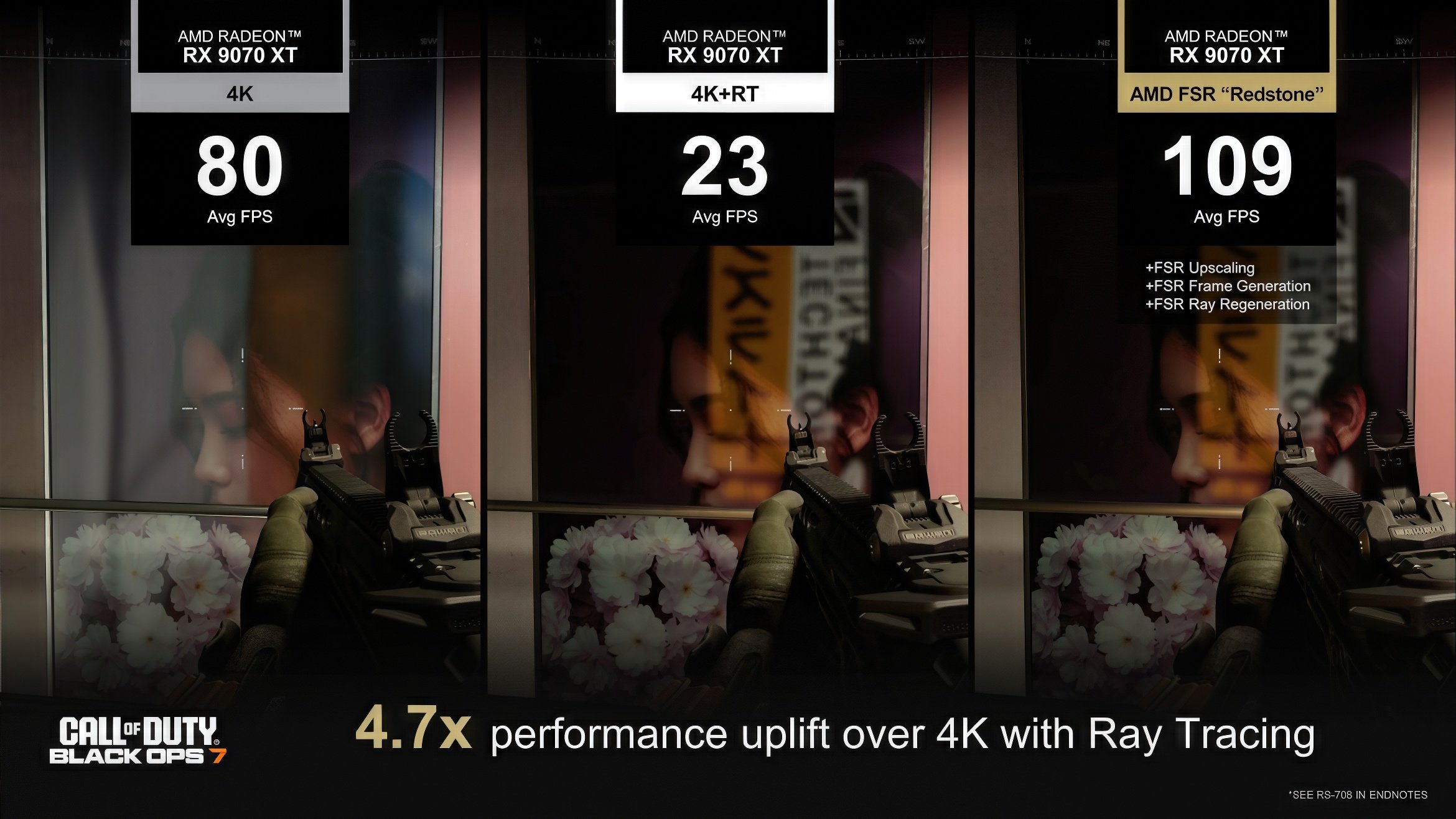 Τα νούμερα που δείχνει η ίδια η AMD είναι επιθετικά: σε Radeon RX 9070 XT, με 4K, ray tracing και ενεργό FSR Redstone (ML upscaling συν ML frame generation), η εταιρεία μιλά για μέσο κέρδος 3,5 φορές στα καρέ ανά δευτερόλεπτο, με τίτλους όπως Call of Duty: Black Ops 7 και Cyberpunk 2077 να φτάνουν μέχρι και 4,7 φορές πάνω από το native 4K. Αυτά είναι vendor νούμερα σε «ιδανικό» σύστημα, οπότε στην πράξη θα τα βλέπουμε ως τάξη μεγέθους, όχι ως εγγύηση, αλλά δίνουν εικόνα του τι μπορεί να πετύχει ένας καλά ρυθμισμένος συνδυασμός upscaling και frame gen.