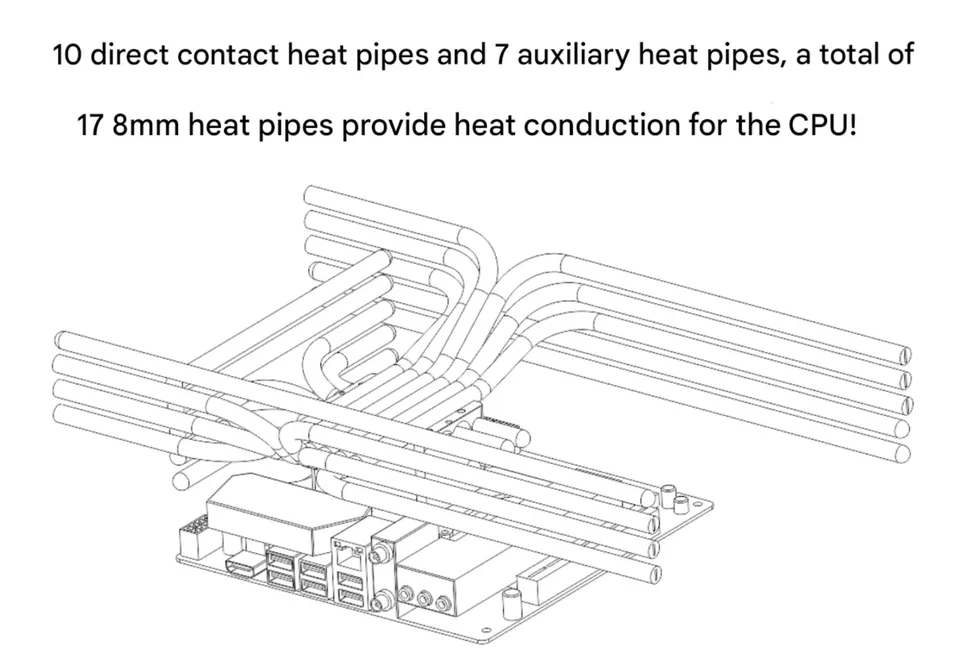 Η ψύξη βασίζεται σε 17 heat pipes των 8 mm που μεταφέρουν θερμότητα από την CPU προς εξωτερικά πτερύγια, καθώς και σε ένα 10 mm heat pipe σε συνδυασμό με vapor chambers για την GPU. Η συνολική επιφάνεια διάχυσης φτάνει τα 1,3 m², ένα νούμερο που θυμίζει high-end air coolers αλλά σε παθητική μορφή.