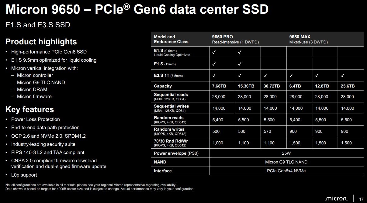 Το PCIe Gen6 διπλασιάζει το θεωρητικό bandwidth ανά lane σε σχέση με το Gen5, φτάνοντας τα 64GT/s και προσφέροντας συνολικό throughput έως και 256GT/s σε διασύνδεση x4. Στην πράξη, αυτό επιτρέπει στον Micron 9650 να επιτυγχάνει ταχύτητες ανάγνωσης μέχρι 28GB/s και εγγραφής έως 14GB/s, τιμές που καθιστούν εφικτό το real-time feeding απαιτητικών clusters με GPU τελευταίας γενιάς και υψηλής ενεργειακής πυκνότητας. Η παράλληλη αξιοποίηση νέας γενιάς NAND, σχεδιασμένης αποκλειστικά για enterprise workloads, εξασφαλίζει σταθερότητα, ασφάλεια και εντυπωσιακή διάρκεια ζωής ακόμη και σε περιβάλλοντα διαρκούς πρόσβασης και ανανέωσης δεδομένων.