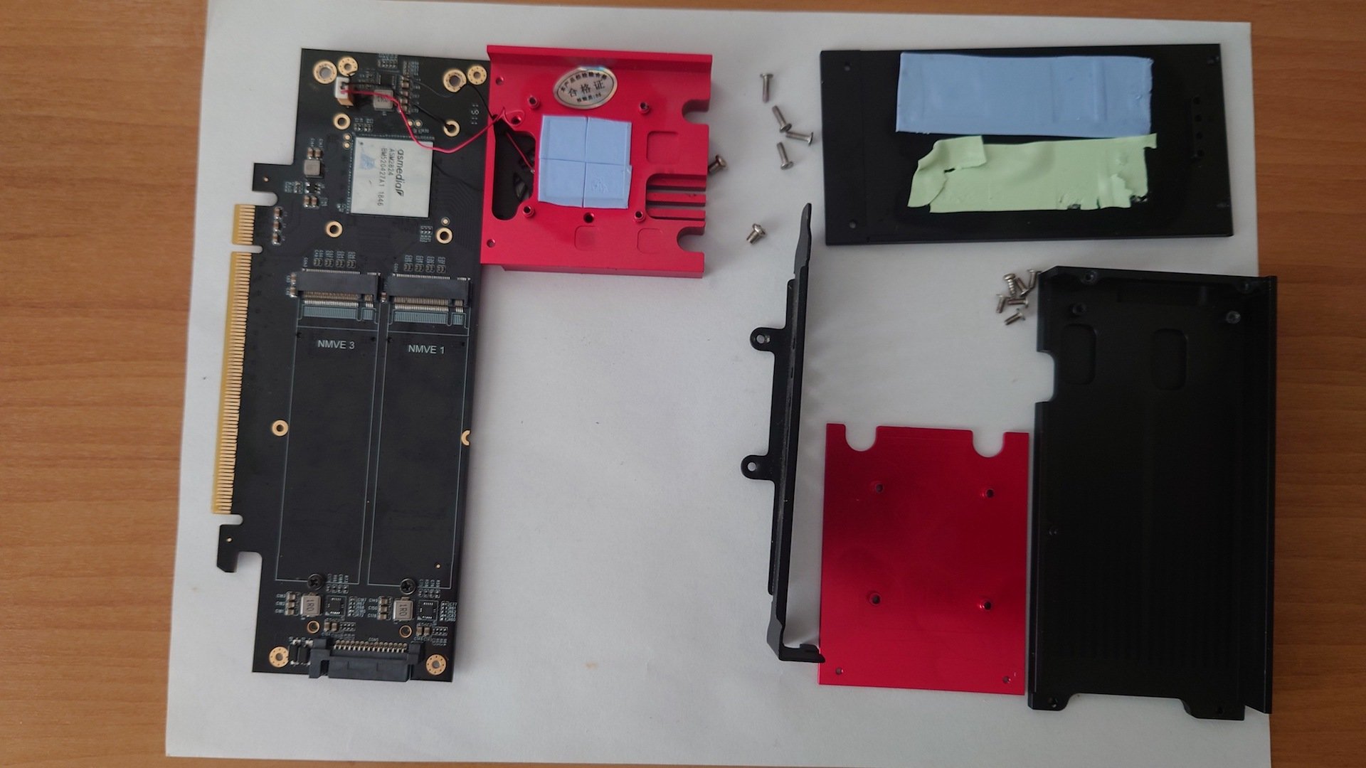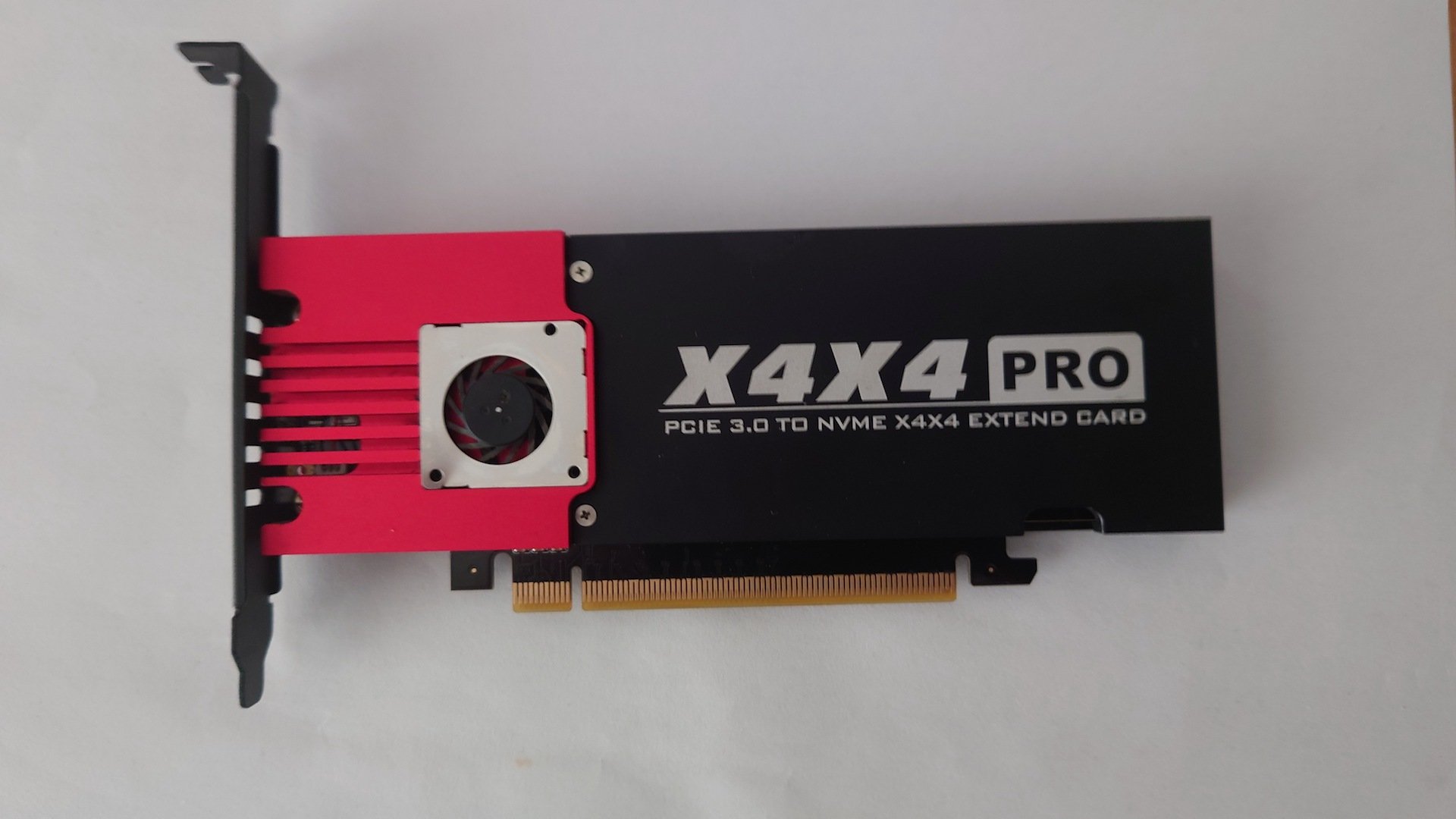 Πωλείται κάρτα x16 PCIe 3.0 Switch (Soft RAID), Jeyi X4X4 Pro, η οποία δέχεται μέχρι 4 NVMe. Παίρνει τροφοδοσία από ένα κοινό 15-pin SATA power cable. Έχει ένα μικρό ανεμιστηράκι το οποίο κάνει κάποιο θόρυβο (ίσως βρίσκει κάπου), οπότε καλό θα ήταν κάποιος να το κοιτάξει. Δεν υπάρχουν τα thermal pads για τα NVMe αφού τα είχα ήδη χρησιμοποιήσει.