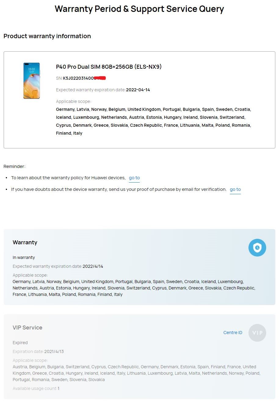 Με υπόλοιπο εγγύησης έως 14/4/2022, κανονικά από την επίσημη αντιπροσωπεία εντός Ελλάδας (ΔΕΝ διατίθεται το παραστατικό – απόδειξη λιανικής). Δείτε τη σχετική φωτογραφία. Έπειτα από τηλεφωνική επικοινωνία με το "HUAWEI Authorized Service Center Athens" επιβεβαιώθηκε ότι η εγγύηση ισχύει κανονικά μόνο με το ΙΜΕΙ/Serial Number του τηλεφώνου χωρίς να είναι απαραίτητη η απόδειξη