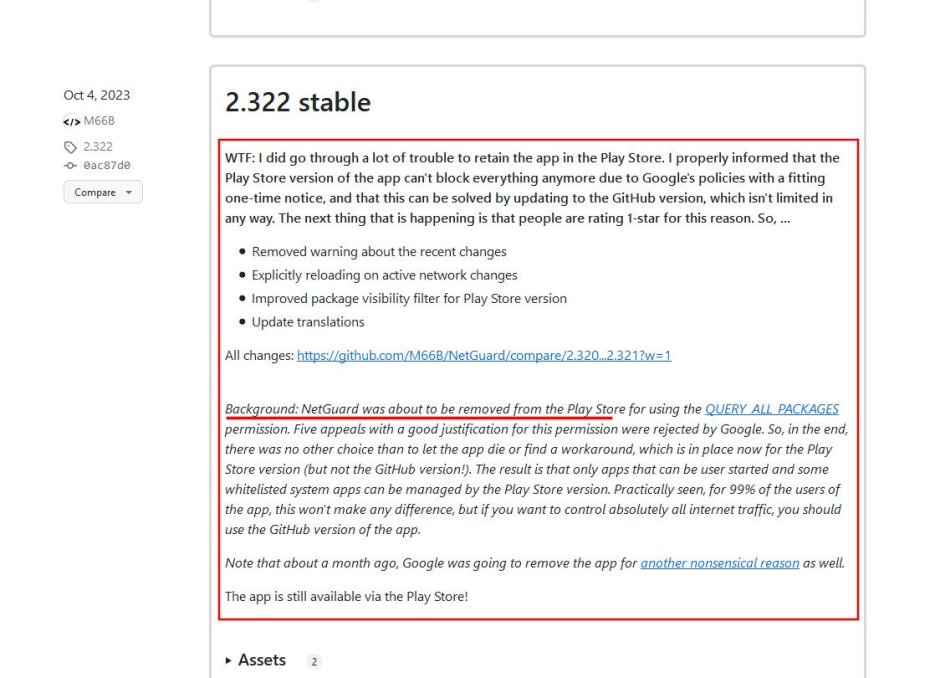 17. Αν αναρωτηθεί κάποιος γιατί δεν είναι διαθέσιμη στην playstore έκδοση η προσθήκη HOST αρχείων όπως περιέγραψα στο αρχικό άρθρο νομίζω ότι σωστό είναι να προσθέσω τα λόγια του προγραμματιστή της εφαρμογής για αποφυγή για να διώξω κάθε υποψία κακόβουλης πρόθεσης από πλευράς του δημιουργού του NetGuard! Θα προσθέσω την εικόνα αλλά και το λινκ με τα λόγια του στα αγγλικά και μετά την επεξηγηματική μετάφραση ώστε να μην χαθεί / αλλαχθεί με την πάροδο του χρόνου. εΛεύθερη μετάφραση στην 1η παράγραφο της 2.322 έκδοσης αναφέρει οτι ουσιαστικά έμπλεξε με την έκδοση της εφαρμογής στο Playstore γιατί σύμφωνα με την νέα πολιτική της "ΓΚ0ΥΓΚΛ"αγκ δεν επιτρέπεται πλέον η εφαρμογή να μπλοκάρει ΚΑΙ τις ΕΦΑΡΜΟΓΕΣ ΣΥΣΤΗΜΑΤΟΣ (όλο το ζουμί εδώ είναι) κάτι που μπορεί να κάνει και θα συνεχίσει να κάνει η έκδοση του github που άφησα στο quote ώστε να μην μπερδεύεστε. στην 2η παράγραφο εξηγεί ποιον τεχνικό περιορισμό επέβαλε το playstore και οτι αν δεν συμμορφωνόταν κινδύνευε η εφαρμογή με αφαίρεση από το playstore, κάτι που ουσιαστικά θα ήταν δυσφημιστικό για την εφαρμογή ( δικά μου λόγια....) Τελικά ο προγραμματιστής έγραψε ότι βρήκε τεχνική λύση και ότι πλέον συμμορφώθηκε με "ΤΑΣ Υποδείξεις και ως εκ τούτου" η εφαρμογή του playstore παρέμεινε χωρίς την δυνατότητα να μπλοκάρει και τις εφαρμογές συστήματος (π.χ. τις πάσης φύσεως απομακρυσμένες προσβάσεις που έρχονται "πακέτο" με τα κινητά ) και γιαυτό παρέμεινε αλλά με μόνο 5 εκατομμύρια downloads στο playstore μιας και είμαι σίγουρος οτι αυτός που θα την βάλει δεν θέλει ημίμετρα