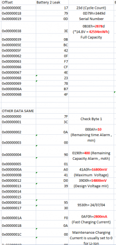 11,1 είναι η συστοιχία άφορτη (3χ3.7V). Όταν φορτίσει θα είναι ~3χ4.2=12.6V H πλακέτα της μπαταρίας πέρα από ασφάλειες και κυκλώματα ισχύος, έχει και έναν ελεγκτή φόρτισης/αποφόρτισης και προστασίας (Overvoltage, Overcurrent, Overcharge). Συνήθως αυτά είναι της TI (Texas Instruments ) και ο κωδικός τους ξεκινά από "BQ", είτε Mitsubishi (με κωδικό από M), είτε άλλες ασιατικές μάρκες λιγότερο γνωστές. Αναλόγως την πλακέτα ενδέχεται συνοδευτικά σε αυτό το κύκλωμα να υπάρχει ένα ξεχωριστό τσιπάκι μνήμης Eprom, το οποίο κρατάει στοιχεία χρήσης και κατάστασης της μπαταρίας (κάποιοι ελεγκτες την έχουν ενσωματωμένη ). Εάν αλλάξεις τα στοιχεία θα πρέπει να κάνεις reset αρκετά από τα νούμερα που κρατάει αυτή η μνήμη. Αυτό γίνεται από εξειδικευμένα προγράμματα και με κατάλληλη συνδεσμολογία στη μπαταρία, είτε με αποκόλληση του τσιπ μνήμης και επαναπρογραμματισμό του σε κατάλληλο programmer. Ενδεικτικά το περιεχόμενο μιας μνήμης μιας μπαταρίας περιέχει τα παρακάτω ( μετά από αποκωδικοποίηση από το hex περιεχόμενό της ) : Δεδομένου ότι για να κολλήσεις τα στοιχεία 18650 μεταξύ τους, κανονικά απαιτείται ηλεκτροπόντα, ώστε να κολληθούν με ασφάλεια και να μην αλλοιωθούν τα χαρακτηριστικά τους από τη θερμότητα της κόλλησης, καλό θα ήταν εάν σκοπεύεις να ασχοληθείς με τη μπαταρία να διαβάσεις αρκετά περι χειρισμού των στοιχείων λιθίου, καθώς τα ατυχήματα με αυτά είναι αρκετά σοβαρά. Εάν αποφασίσεις να ασχοληθείς ( καθαρά για εκπαιδευτικούς λόγους, αφού μπορείς να πάρεις μια αντίστοιχη μπαταρία από το νετ πλέον ) ίσως θα μπορούσες να παραγγείλεις στοιχεία έτοιμα κολλημένα στη συστοιχία που θές ( 3S2P στην περίπτωσή σου ) και να αναλωθείς στην εύρεση πληροφοριών και αγορά εξοπλισμού για το reset. EDIT : προσπάθησε να γράφεις με κενά για να είναι πιο ευανάγνωστο το κείμενο. -
