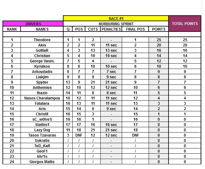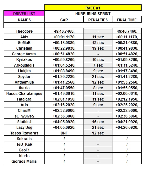 Καλημερα. Ωραιος αγωνας.Μπραβο στον @Thodoris1884.Δεν μπορουσα να βρω το μισο δευτερολεπτο που ειχαμε διαφορα.Πιστευα οτι θα με "τραβαγε" στον αγωνα αλλα μετα απο μια ατυχια με τον Τασο, τρακαραμε και ξεφυγατε..Απο την καθυστερηση, μας εφτασε ο @Oxide Burnedbrain στο 1-2 δευτερολεπτα διαφορα!.Στους τελευταιους 2 γυρους πιεζα αρκετα τον Τασο για την 3η θεση μεχρι που μενει απο βενζινη ο ηλιθιος Μπορει να στεναχωρηθηκα για το φιλαρακι μου αλλα κατα βαθος χαρηκα Μπραβο στον @akis_z80 που αν και χτυπημενος (μλκιες,ετσι λεει.η αεροτομη ακομα στο αμαξι πανω ηταν..:hehe:) καταφερε να καλυψει την διαφορα και να διεκδικησει την 1η θεση. @Lazy DogΔε ξερω τι εγινε,ποιος σε πειραξε.Report και θα τον κανονισουμε Μπραβο σε μενα για το φοβερο στησιμο του σερβερ που ηταν ολα στην ωρα τους και με τους σωστους χρονους Μπραβο σε ολους γενικα.Χαρηκα δε σας κρυβω οτι μαζευτηκαν 19 ατομα στο πρωτο αγωνα.Πιστευω στους επομενους να ειμαστε περισσοτεροι.Επισης τα λαθακια στις ωρες του σερβερ δεν εγιναν σκοπιμα,ηταν ολα μελετημενα απο το απογευμα , αλλα καταλαθος ανοιξα τελευταια στιγμη αλλο αρχειο και ειχε τις παλιες ρυθμισεις.Ζητω συγνωμη σε ολους λοιπον και για καποιους που δε προλαβαν να πανε για την αναγκη τους Σημερα φευγω.Θα παρω το μηχανημα μαζι να εξετασω οσο μπορω τα reports στο εξοχικο μου.Σε συνεοηση με τον Τασο,θα ανακοινωσουμε και τις τελικες θεσεις(συμφωνα με τα cuts-στις στροφες που ανεφερα) και τις τελικες βαθμολογιες. Σας ευχαριστω ολους εγω.Την επομενη Τεταρτη θα ειναι καλυτερα Υ.Γ Το καλυτερο skin ειναι του @geovas77 και του @Anthemius.Τελος