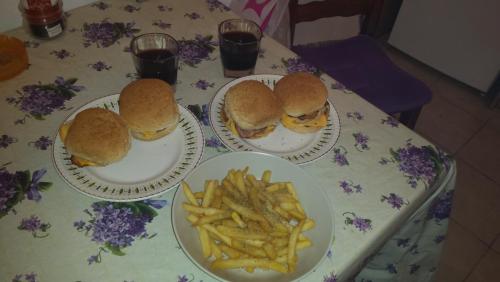 Σπιτικά hamburger με κιμά κοτόπουλου διπλό bacon διπλό cheddar κέτσαπ, πατάτες και κόκκινο ημιγλυκο κρασί