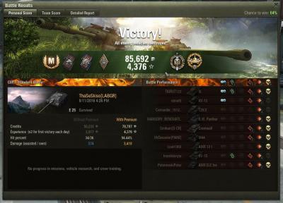 Ε ναι αδερφέ,έτσι πρέπει,εγώ έφτασα αργά κι έπεσα κατευθείαν μπροστά στις κάνες σας,μία με μπλόκαρε στη βάση το γίδι με το Τ10 και μία κάτω στις φάπες.Χθες για να πάρω νίκη με το Ε5 αγανάκτησα.Ένα θα σου πω,65% μας έδινε να νικήσουμε και χάσαμε 15-2. Σε μία νίκη που έκανα αν δεν έπαιζα το ISU152 σαν med δεν υπήρχε περίπτωση να την πέρναμε.Είχαμε jpanther II και περίμενε να τους ανάψω εγώ,σαλτάρησα χθες.Έφυγες από τους KISS? Πήρα κι εγώ το batchat το 9άρι,αλλά δεν το κουνάω χωρίς αναρτήσεις,μαζεύω freexp