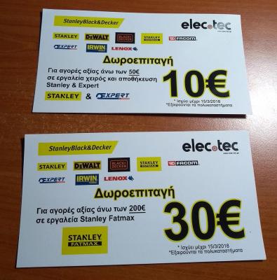 Το βάζω εδώ μιας και αφορά τους μάστορες : Χαρίζω 2 δωροεπιταγές από την έκθεση Elec Tec για αγορά εργαλείων Η πρώτη είναι για 30 ευρώ και αφορά αγορές εργασλείων Stanley Fatmax άνω των 200 ευρώ Η δεύτερη είναι για 10 ευρώ και αφορά αγορές εργαλείων χειρός και αποθήκευσης Stanley και Expert by Facom. Ισχύουν για αγορές μέχρι 15/3/2018 και εξαιρούνται τα πολυκαταστήματα (praktiker κλπ) -