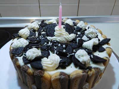 Υλικά Μία συσκευασία σαβαγιάρ 300 γρ γάλα 660 ml κρέμα γάλακτος 35% λιπαρά 360 γραμμάρια κουβερτούρα (εγώ την έκανα με λευκή, γίνεται και με σοκολάτας γάλακτος, όχι με την κλασσική γιατί όλη η ζάχαρη είναι από την κουβερτούρα) 3 φύλλα ζελατίνη 1 συσκευασία oreo για το γαρνίρισμα Εκτέλεση Παίρνουμε ένα τσέρκι περίπου 23 εκατοστά. Από τα σαβαγιάρ κόβουμε κάπου 1.5 εκατοστό και τα βάζουμε περιμετρικά στο τσέρκι και στρώνουμε και μία βάση από σαβαγιάρ. Εννοείται ότι χρησιμοποιούμε και τα κομματάκια που μας έμειναν από το περιμετρικό για να κλείσουμε τρύπες. Κόβουμε την κουβερτούρα σε κομματάκια. Χτυπάμε τα 530 γραμμάρια της κρέμας γάλακτος μέχρι να γίνει μια σαντιγύ με υφή γιαουρτιού. Δε θέλουμε να πήξει πολύ. Την αφήνουμε στο ψυγείο όσο ετοιμάζουμε τα υπόλοιπα. Βάζουμε τις ζελατίνεςσε κρύο νερό να μαλακώσει. Ζεσταίνουμε το γάλα μέχρι να πάρει μία βράση και το αποσύρουμε από τη φωτιά. Το αφήνουμε να κρυώσει δύο λεπτά και ρίχνουμε τις ζελατίνες αφού τις στραγγίξουμε καλά και ανακατεύουμε να διαλυθούν. Κρατάμε το μισό γάλα σε ένα μπωλ και στο κατσαρολάκι με το υπόλοιπο ρίχνουμε την κουβερτούρα και ανακατεύουμε μέχρι να διαλυθεί. Προσθέτουμε το γάλα που είχαμε κρατήσει πριν. Εάν η κουβερτούρα δεν έχει λιώσει καλά, ζεσταίνουμε ελαφρά το μίγμα. Στο μίγμα κουβερτούρας - γάλακτος ρίχνουμε την σαντιγύ και ανακατεύουμε μέχρι να ομογενοποιηθεί. Η μους είναι η έτοιμη οπότε την ρίχνουμε στο τσέρκι μέχρι να φτάσει στο ύψος τα σαβαγιάρ. Τη βάζουμε στο ψυγείο για τουλάχιστον 3 ώρες ώστε να σφίξει η μους. Στολίζουμε με τριμμένα oreo. Την κρέμα γάλακτος που περίσσεψε την χτυπάμε σαντιγύ στο mixer με ζάχαρη άχνη (1 κουταλιά της σούπας το πολύ) και εάν έχουμε βάζουμε και μισή κουταλιά του γλυκού κρεμόριο ώστε να σφίξει καλά. Με ένα κορνέ στολίζουμε την τουρτα και με σαντιγύ. Η συνταγή της μους είναι του πετρετζίκη και για την τούρτα έχω κάνει τα υλικά επί 1.5.