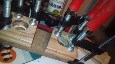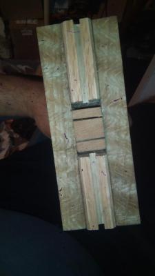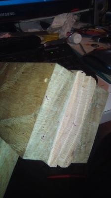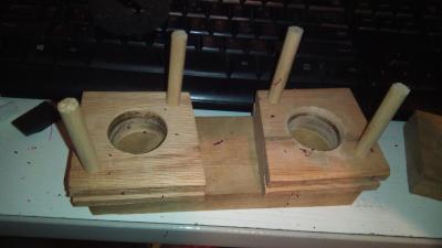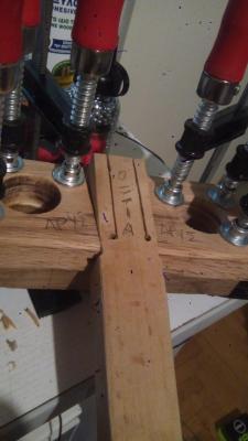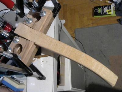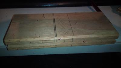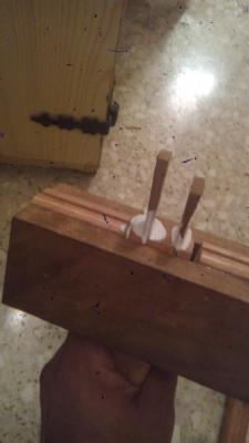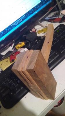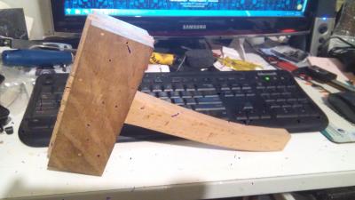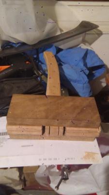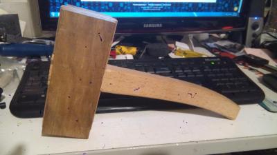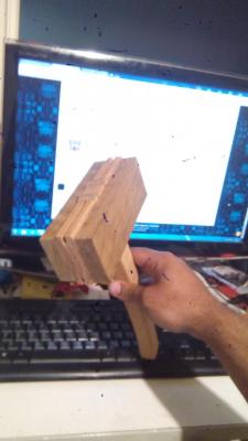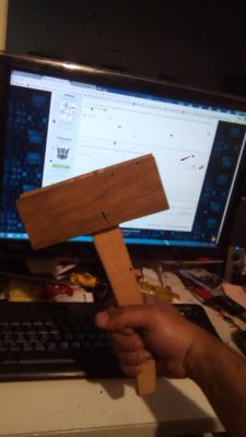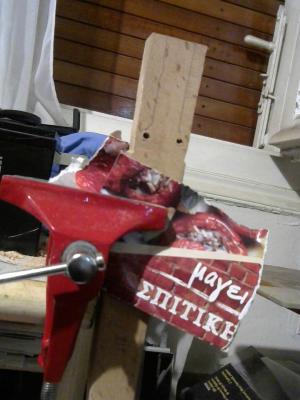 Χρόνια πολλά κ. Κώστα!!! Πήγα από κάτω σε ένα ξυλουργείο και του ζήτησα σκληρά ξύλα... Μου έδωσε 2 ρεταλάκια από δρυ.... Τα έκοψα στην καινούργια μεγγενούλα και σημάδεψα....... Το ανοιχτόχρωμο μπήκε στην μέση και κόπηκε όχι κάθετα αλλά με λίγη κλίση για να μπεί το παλούκι που θα το κρατάει στο χέρι... ΠΩΩω λέω...πάμε πάλι κάτω... μου έδωσε ένα πόδι απο τραπέζι απο οξιά...το έκοψα και το έβαλα για χειρολαβή... Κόλλημα και τρύπημα στο ανοιχτόχρωμο κομμάτι με ποτηρο τρύπανο για να το γεμίσω μέσα με βολίδες από αεροβόλο... 4,5mm... Τρύπες για να μπούν καλίβιες...εδώ μάλλον το παράκανα και έκανα 4 τρύπες αντί για 2 που σκεφτόμουν αρχικά.... Κόπηκε το πόδαρικό από το τραπέζι ( χειρολαβή) και γίνανε τρύπες στην χειρολαβή για να μπούν μετά σφήνες και να μην φύγει ποτέ.... Σπιτικό μαγειρείο Ότι περίσσευε από τα πλαινά κόπηκε... Σφήνες και κοπάνημα με κόλλα παρέα... Ότι περίσσευε από πάνω από τις σφήνες κόπηκε... Φωτό με τις βολίδες μέσα ξέχασα να βγάλω Το μόνο που μένει να γίνει είναι να το περάσω με μελλισοκέρι μαζί με παραφινέλαιο! Το βάρος είναι 680 γραμμάρια...