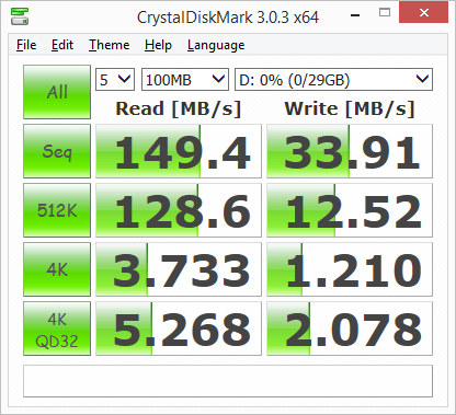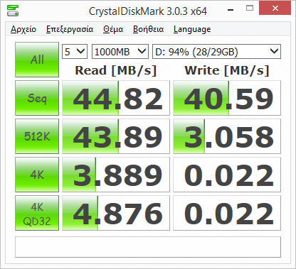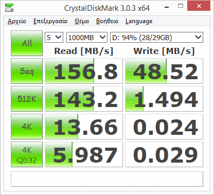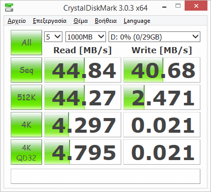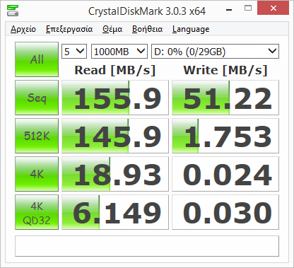 Δοκίμασα με 1000MB (προεπιλογή προγράμματος) και οι ταχύτητες είναι πολύ καλύτερες. Καλύτερες και απο τις ονομαστικές (120MB/s Read - 45MB/s Write σε USB3 και 30MB/s Read - 25MB/s Write σε USB2) USB3 άδειο και γεμάτο USB2 άδειο και γεμάτο- 309 απαντήσεις