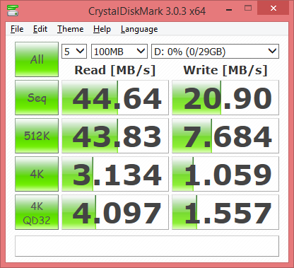 Kingston DataTraveler R3.0 G2 32GB (20€ προσφορά e-shop) USB3 USB2 Αυτό το πρόγραμμα σίγουρα μετράει τα writes σωστά; Γιατί χρησιμοποιώντας ένα αρχείο 4GB+ και αντιγράφοντας το (σε SSD) με τη χρήση χρονομέτρου έχω τα παρακάτω: Σε USB3 140ΜΒ/s Read - 48MB/s Write Σε USB2 42MB/s Read - 40MB/s Write Τα reads είναι πολύ κοντά σε αυτό που μέτρησε το πρόγραμμα αλλά τα writes απέχουν πολύ. Υπάρχει λόγος που συμβαίνει αυτό; Το ρωτάω κιόλας γιατί θέλω να καταχωρήσω τα αποτελέσματα αλλά δεν ξέρω ποιά.- 309 απαντήσεις