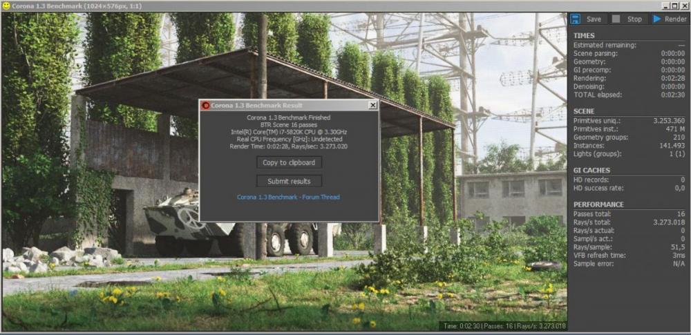 νεο μπεντσακι για cpu μετραει απο οτι λεει εως 72 thread και αυτο σημαινει οτι ειναι φτιαγμενο για heavy hyperthreading κατεβαζετε απο δω και τρεχετε δε θελει εγκατασταση και καμμια ρυθμιση τελειωνει μονο του καποιοι ειχαν θεμα με εντολες SSE 4.1(δε ετρεχε πχ phenom X6) http://www.guru3d.com/files-details/corona-cpu-benchmark-download.html επισης ποιος θελει μπορει να παρει μερος στη καταταξη τους https://corona-renderer.com/benchmark/?result_page=1 κανω την αρχη ! !!!!!!!! γραψτε και τιποτε τα ρολογια σας μνημες κλπ 5820κ @ 4.7 cache @ 4.0 mem 16 giga @ 2400 quad channel