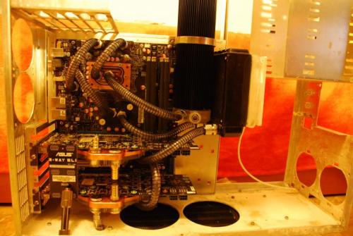 Γίνεται λίγο πανικός, μέχρι να φτιαχτούν και τα κουτιά των ψυγείων Όπως είπα είναι ακόμα υπό κατασκευή, απλά επειδή κάνει πολύ ζεστή για μαστορέματα ασχολούμαι με την υδρόψυξη Ξεκινάμε με αντλία στο τριπλό ψυγείο, μπλοκ cpu, mofset 1, mofset 2, sb, μονό ψυγείο,nb , διπλό ψυγείο, vg1, vg2, tank , και αντλία block 11 ek τα άλλα