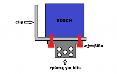 Στράβωσε μέταλλο και φτιάξε και μια βάση για bits όπως εδώ. Θα τη βιδώσεις στις δύο υποδοχές που ήδη υπάρχουν. πρόχειρο παράδειγμα.- 1.111 απαντήσεις