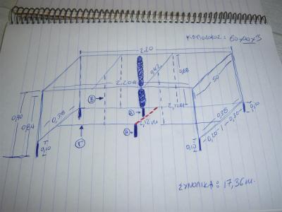 Κατασκευή εργαστηρίου - μέρος 3ο Στο προηγούμενο επεισόδιο είχα μείνει στα στοκαρίσματα, αλλά κάτι η δουλειά κάτι οι διακοπές, άργησα να ενημερώσω με update. Πέρασα ακόμα δύο χέρια στόκο την γυψοσανίδα στην πόρτα και έτριψα ότι μπορούσα, συμπεριλαμβανομένων και τα χοντρά στους τοίχους. Το τρίψιμο είναι το χειρότερό μου.... μόνο από την πόρτα βγήκε ενάμιση φαράσι. Ακολούθησε το βάψιμο. Λευκό ταβάνι αλλά όχι οι τοίχοι για να μη φαίνεται εύκολα η βρωμιά. Στην πόρτα η επιμονή μου με το σπατουλάρισμα/τρίψιμο απέδωσε, αφού έγινε αόρατη. Αν προσέξετε κάτω δεν έβαλα σοβατεπί σε περίπτωση που ξανανοίξει κάποτε. Καθαρίστηκε το πάτωμα και τα σοβατεπιά. Μπήκε πρόχειρα η ραφιέρα του Lidl, με κάποια πράγματα που μάζεψα από σωρεία κουτιών που τα είχα πεταμένα. Χωράει πολύ πράμα η συγκεκριμένη και συστήνω την αγορά της. Από το πατάρι ξέθαψα κάποια ξύλινα συρτάρια, απομεινάρια από την ανακατασκευή που έκανα κάποτε σε κάποιες ντουλάπες. Σκέφτομαι να τα εντοιχίσω κάτω από έναν πάγκο γιατί είναι μεγάλα και χωράνε πολλά εργαλεία. Έκανα ένα σχεδιάγραμμα του ενός πάγκου που σκέφτομαι να φτιάξω από κοιλοδοκό 60x40x3, και θα ήθελα τη γνώμη σας μήπως μου διαφεύγει κάτι. Τα κάθετα τμήματα (διακεκομμένα -Β-) θα μπουν για να μην κάνουν κοιλιά τα οριζόντια των δύο μέτρων. Το -Γ- δεν το έβαλα μπροστά αλλά λίγο πιο πίσω απ' τη μέση, για να έχουν χώρο τα πόδια όταν κάθεσαι. Τα ποδαράκια -Α- μπαίνουν για να μη κρεμάσουν τα οριζόντια -Γ- μήκους 2.12 μέτρων. Είπα τις δοκούς -Γ- να τις σηκώσω απ' το έδαφος 10 πόντους, ώστε να χωράει σκούπα από κάτω σε περίπτωση που βάλω κάτω ράφι. Αυτό που δεν είμαι σίγουρος, είναι αν χρειάζεται να ενώσω τις δύο δοκούς -Γ- με τη κόκκινη διακεκομμένη. Το σκέφτομαι γιατί όταν κάθεσαι και απλώνεις πόδια, αυτά θα πιέζουν την πρώτη προς τα μέσα. Ο πάγκος αυτός δεν θα είναι για κοπάνημα ούτε θα έχει βαριά εργαλεία επάνω. Ίσως είναι λίγο υπερβολή αλλά στα 2.2 μέτρα θέλει την ενίσχυσή του. Όσον αφορά τις δοκούς θα κολληθούν με τη πλευρά των 60 χιλιοστών στο κάθετο. -