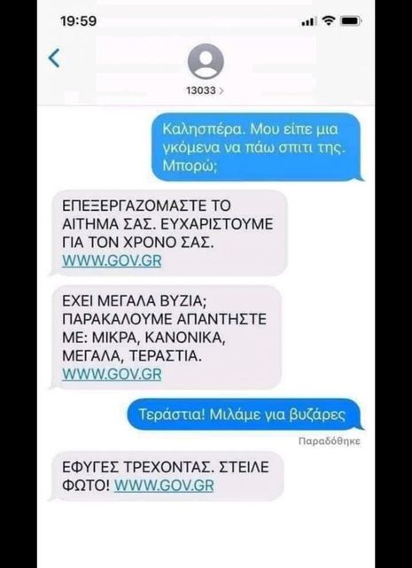 Για φαντάσου για χαβαλέ να στείλεις μήνυμα για σούπερ μάρκετ και να μην πας. Εγώ την ίδια ώρα πάω στο ίδιο σούπερ, και μετά από τρεις μέρες βρίσκομαι θετικός. Ίσως από τις εταιρείες κινητής μπεις και εσύ σε καραντίνα.