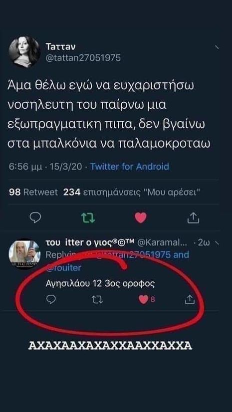 Για τους αγέννητους, θυμήθηκα τι πάθαμε το καλοκαίρι του 1987. https://www.protothema.gr/greece/article/692095/o-fonikos-kausonas-tou-1987/ Θα μου πεις τώρα τι σχέση έχει αυτό; Άλλη περίπτωση. Έτσι και τότε κανείς δεν το περίμενε, ο μηχανισμός ήταν απροετοίμαστος, και όλοι νόμιζαν ότι ο κόσμος πεθαίνει σε άλλες γειτονιές. Μέχρι που 50 μέτρα απ' το σπίτι μια γειτόνισσα παρακάλεσε τον αδερφό μου, να πηδήξει τα κάγκελα για να τσεκάρει μια γιαγιά που δεν είχαν δει μέρες. Μαντέψτε...