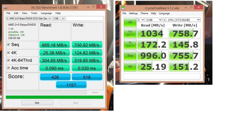 5. Καλησπέρα.Είχα έναν 840Pro 128gb αλλά επειδή δεν μου έφτανε ο χώρος αγόρασα άλλον ένα για να τους βάλω σε raid-0. Το πρόβλημα είναι ότι στο bios της μητρικής όταν αλλάζω το sata configuration από achi σε raid εμφανίζει μια επιλογή που λέει : Board sata Raid Rom και έχει τρεις επιλογές 1)Legacy ROM 2)UEFI Driver 3)Disable . Αν επιλέξω κάτι άλλο εκτός από το legacy rom δεν ανοίγει το amd raid utility στα bios για να φτιάξω το raid. Άν το φτιάξω πρώτα (legacy rom) και το αλλάξω μετά (uefi driver) για να κάνω εγκατάσταση τα windows δεν μπαίνουν με τίποτα στο raid. Τι φταίει ? Πως μπορώ να το φτιάξω αυτό και να δουλέψει το uefi rom αντί για το legacy? Επιπλέον ώρες, ώρες βλέπω το pc και αργεί να αποκριθεί. Δηλαδή κάνεις κάπου κλικ να τρέξει μια εφαρμογή και είναι σαν τους παλιούς wd green που περίμενες να ανεβάσουν στροφές πρώτα και μετά να τρέξει..... Θα βάλω και screenshot από 2 προγράμματα για να μου πείτε αν είναι φυσιολογικές οι ταχύτητες στους δίσκους... Το σύστημά είναι : FX8320 2x4Gb 2400Mhz DDR3 Asus Sabertooth 990FX R2.0 Sapphire Tri-x R9 290