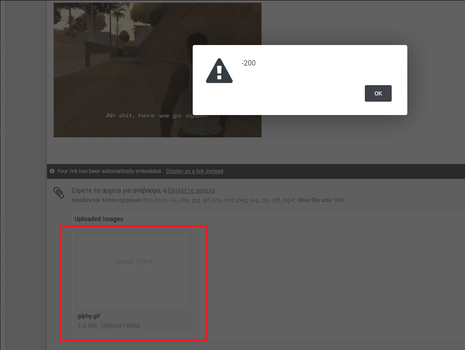 - 200 ? Το gif ειναι αυτο https://giphy.com/gifs/8vIFoKU8s4m4CBqCao για οποιον θελει να δοκιμασει. Σαν λινκ ενω φαινεται εικονα το παρουσιαζει ως λινκ αφου στειλεις την απαντηση. Αν κανεις να το ανεβασεις παλι δεν σε αφηνει και δινει το παραπανω μηνυμα. Ερωτηση αν και στα αρχεια λεει ως Max file size 5MB μηπως ειναι τελικα ειναι για ποιο μικρα σε μεγεθος ? -
