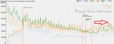 Λοιπον καποιος να ενημερωσει τη wiki εδω κατι συμβαινει εγω θυμομουν μονο την Beta 2/15 δεν θυμαμαι να επαιξα τον 6/14 αλλα δεν εχει τοση σημασια επανω στην αρχικη μας διαφωνια γιατι αυτη η φωτογραφια και σωστη ειναι και ημερομηνιες εχει. Απο 9/11/13 μεχρι 27/8/14 μιλαμε για 10 μηνες και κατι ψιλα. Οπως βλεπουν τα ματακια μου απο 15 Ιουλιου του 14 περιπου μεχρι και τις 27 του Αυγουστου του 14 ειναι πανω απο 40Κ. Σχεδον ολος ο Αυγουστος ειναι πανω απο 40Κ και βαραει και 70Κ γιατι εκεινο τον μηνα επι μια βδομαδα το παιχνιδι ηταν δωρεαν. Απο που βγαινει το συμπερασμα οτι το ελαχιστο peak τον Αυγουστο του 14 ηταν 32Κ ??? Πηγη https://twitter.com/PStatsNet Και επειδη δεν εχω το παιχνιδι αρχισα να ενημερωνομαι περισσοτερο για rented server, cheaters μπας και το παρω τελικα, εχουν βγει και καμια 10αρια patch ειναι και επιτυχια κατα την γνωμη σου και μπορει να κανω λαθος εγω τελικα και το θεμα αποκτα ενδιαφερον... Διαβαζω στο Battlefield forum το οποιο μονο forum δεν το λες ειναι σαν να ζουνε τα παλικαρια σε χουντα απο την λογοκρισια το εξης: Banlist limited στα 100 ατομα δηλαδη αν καποιος admin εχει 100 cheateria banlist πρεπει να βγαλει εναν για να βαλει καποιον αλλον cheater. Σοβαρα τωρα ? Πραγματικα δεν ξερω αν ειναι για γελια η για κλαματα αυτη η καταντια... Τετοια μεγαλη εταιρια και δεν εχει βγαλει ακομα ενα εξελιγμενο προγραμμα να το κανει αυτοματα ? Θα ανακαλεσω οταν μου βρεις τα 32Κ τον Αυγουστο στην φωτογραφια αν παλι δεν μπορεις ανακαλεσε εσυ. Activision & Splash Damage αφου περασαν τις παιδικες ασθενειες ειπαν να κανουν στροφη στην ομαλοτητα.