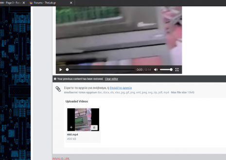 @karmen1983 Συνεχιζει... Το video ειναι απο εδω https://9gag.com/gag/a6KmXB2 Σε mp4 link https://img-9gag-fun.9cache.com/photo/a6KmXB2_460svav1.mp4 Οταν το κατεβαζεις και πας να το ανεβασεις δεν δουλευει. Εβαλα το mp4 link στο ποστ και ανεβασα το video 2 πραγματα μεσα στο ποστ δλδ και link και video δουλεψε μια φορα και μια οχι. https://www.thelab.gr/forums/topic/176719-ttteesttttttttttttt/?page=3&tab=comments#comment-2740400 ---- Δοκιμασα και αυτο το video μπας και ειναι η πηγη το προβλημα αν και εν εχει σχεση το ανεβαζα απο το pc αλλα τπτ και παλι https://file-examples.com/wp-content/uploads/2017/04/file_example_MP4_480_1_5MG.mp4 Sorry για την ταλαιπωρια και το αργοπορημενο ποστ αλλα τετοιο υπνο ειχα να ριξω απο τον στρατο -