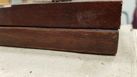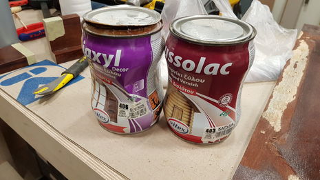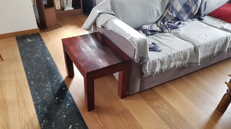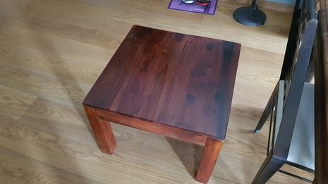 Πηγα να γλιτώσω δουλεια κ εμπλεξα. Παραγγειλαμε μεσω νετ 2 μασιφ τραπεζακια σαλονιου που νομιζαμε οτι ειναι 60 μηκος 45 πλατος και 60 υψος. Το υψος μονο θα ρυθμιζα και θα το κατεβαζα στο 45. Ετσι υπολογιζα τουλαχιστον... Τελικά η εικονα με την προοπτικη της ξεγελασε κ τα τραπεζια ειναι 60μηκος 60 πλατος 45 υψος... Φτου σου! Η τιμη ηταν κομματια, κατω απο 50ευρω κ δεν επαιζε ουτε να φτιαξω κατι αλλα ουυε και κατι αλλο απο το καταστημα αγορας, οποτε ειπα να τα μετατρέψω αντι να τα επιστρεψω... Αποσυναρμολογηθηκαν εν μερη, κοπηκε το καπακι και εγιναν αυτο που θελαμε. Το δυσκολο ηταν να πετυχω το χρωμα στα σημεια κοπης. Το καταφερα παιζοντας για μια ακομα φορα με αναλογιες με τα δυο παρακατω βερνίκια διαλυτου. Αρκετα κοντα κ πραγματικά δεν φαινεται κατι αν δεν προσεξεις παρα πολυ καλα και κατω απο πολυ φως.