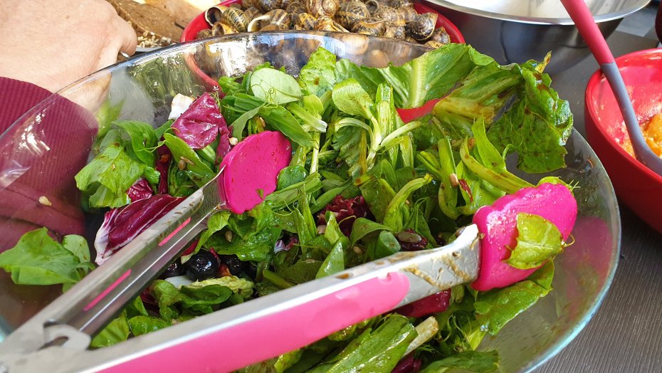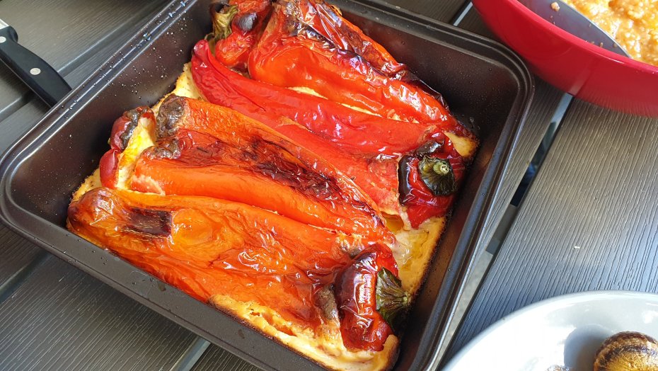Φιλοι μου ζητησαν σαλιγκαρια. Χατίρια για φιλους δε χαλαω. Οποτε τηγανι, δεντρολιβανο, ξυδι κ μπολικο αλατι. Προχωρησε παραδοσιακα το συνοδευτικο που ηταν ξινοχοντρος με πατατες κ ντοματα με κυριο μπαχαρικο το κύμινο. Η σαλατα ειχε μεσα κ παπουλες (νομιζω βοσκισες τις λενε αλλου). Φοβήθηκα να τις κανω μονες τους με φρεσκο σκορδο κ ξυδι μιας κ δεν ειχαν δοκιμασει ποτε, οποτε τις παντρεψα με κατι πιο κλασικο. Και επειδη ειχαμε κ ενα πιτσιρικι στη παρεα που ηθελε γεμιστες πιπεριες του εκανα τη χαρη. Το τραπεζι συμπλήρωσαν 2 ωραια μπουκαλια απο μαλαγουζια και ολοι εμειναν ευχαριστημενοι.