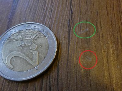 Λοιπόν έχω μείνει πολύ ευχαριστημένη από τις δοκιμές σε AC5 laminate Επιασα ένα μαχαιρι και έξυσα το δείγμα και κόντρα στα "νερά" και κατα μήκος. Μόνο όταν έδωσα πάρα πολύ πίεση (αυτό που λέμε θα σου δείξω εγώ) έκανε γρατζουνια. Πέταξα επάνω του κλειδιά και διάφορα αντικείμενα από μαχαίρι, κατσαβίδι, πένσα μέχρι σφυρί Το έβαλα κάτω από μία καρέκλα γραφείου με ροδάκια και κάθισα επάνω πιέζοντας και έκανα πέρα δώθε. Στα μόνα σημεία που είδα εμφανή σημάδια ήταν στις δοκιμές κρούσης. Οταν πχ το μαχαίρι έσκασε επάνω με τη μύτη και όταν το σφυρί έπεσε από ύψος λίγο πάνω από τη μέση μου. Εμεινα πολύ ευχαριστημένη και θέλω να δω και ένα δείγμα από AC6 με τις ίδιες δοκιμές για να αποφασίσω. Στην πρώτη φωτογραφία είναι το σημάδι που άφησε το μαχαίρι όταν έπεσε με τη μύτη και στη δευτερη το σημάδι από το σφυρί (πρασινο) και πένσα (κόκκινο) -