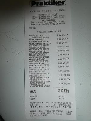 23. και για να ειμαι και ontopic Παρέλαβα από praktiker 11 νουμερα καρυδάκια proxxon 1/2" . Ενα από το κάθε ένα που είχε στο ράφι προς 0,99 έκαστο . Κατσαβίδι mini wolfcraft 1237000 προς 2.99 Μία κασετίνα 18τεμαχίων της proxxon προς 19.99 αντι 45+ στο Skroutz κωδικός proxxon 2310090 https://www.skroutz.gr/c/1717/kastanies_karudakia.html?keyphrase=proxxon+2310090 Πολύ όμορφα με ωραία μεταλλική θήκη και κούμπωμα. Οι τιμές ανα είδος στην απόδειξη Και τέλος από Παυλάτο 4kg ηλεκτρόδια 2.5mm Oerlikon https://www.pavlatos-tools.gr/ilektrosygkolliseis/ilektrodia/ilektrodia-oerlikon-fincord-2-5x350mm-16444-p-5799-html