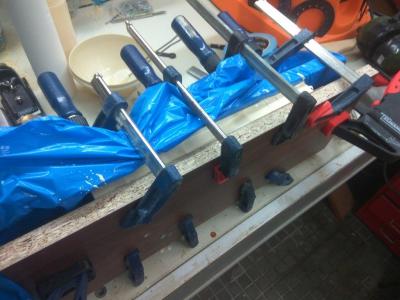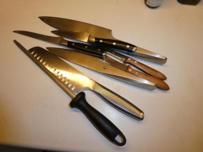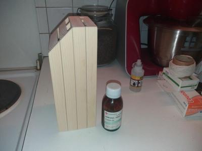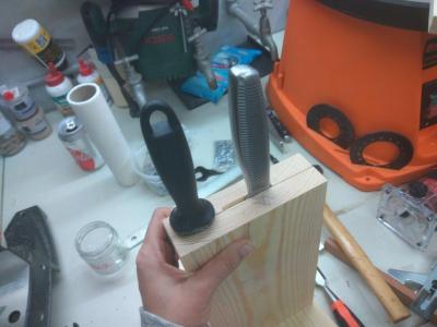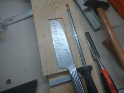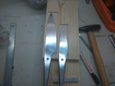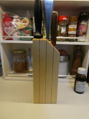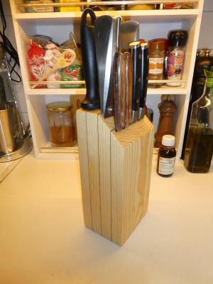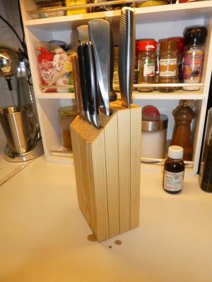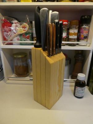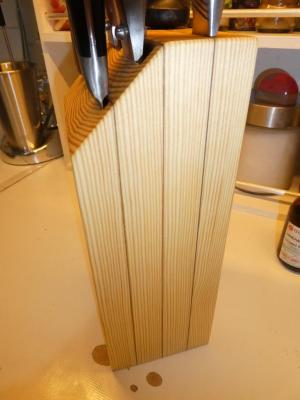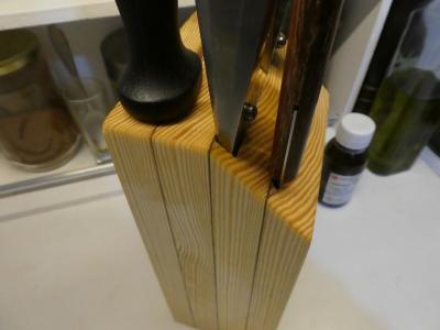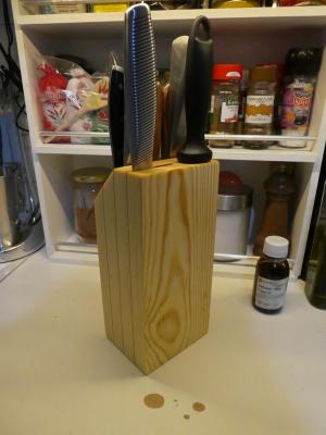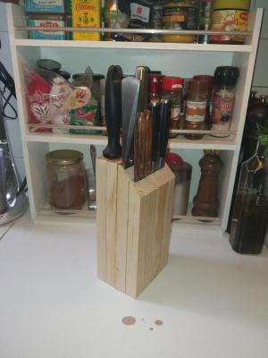 Καιρό έλεγα να βάλω μερικά πράγματα στη κουζίνα σε τάξη Ένα από αυτά που ήθελα να κάνω είναι μία θήκη για τα μαχαίρια κουζίνας (knife block) που χρησιμοποιώ κατά τη διάρκεια του μαγειρέματος. Σκέφτηκα μαγνητική βάση αλλά έχω και έναν γάτο που παίζει με τα πάντα και παντού και φοβήθηκα. Οπότε κατέληξα στο κλασικό σχέδιο από τα παλιά τα χρόνια. Ένα ξύλινο μπλοκ και για να έχει και μια τσαχπινια έβαλα και κομμάτια από καπλαμά καρυδιάς, αλλά πάμε να τα δούμε ένα ένα Αρχικά πήρα μία τάβλα από Πεύκο και έκοψα μερικά κομμάτια Δεν είχα αποφασίσει τις τελικές διαστάσεις οπότε τα κομμάτια κόπηκαν και πιο μακριά και πιο πλατιά από ότι κατέληξαν στο τέλος. Σημείωσα 2-3 φορές διαφορετικές θέσεις για τα μαχαίρια και τελικά ευτυχώς κατέληξα Αφού κατέληξα πήρα το ρούτερ και έκανα τις πατούρες. Ο οδηγός του makita/maktec ρουτερ είναι για τα μπάζα οπότε αφού την έπαθα σε ένα σημείο και χρειάστηκε επιπλέον δουλίτσα αποφάσισα να τον ενισχύσω με ένα κομμάτι ξύλο και να κάνω τη δουλειά μου. και μια πρώτη δοκιμή Και πάμε παρακάτω Αποφάσισα για την τσαχπινιά να βάλω φύλλα καπλαμά ανάμεσα στα ξύλα. Κόπηκαν κομμάτια μπήκε κόλλα και μιας και δεν έχω πρέσα τα έκανα σάντουιτς ανάμεσα σε κομμάτια από μελαμίνη με τη βοήθεια από πολλούς σφιγκτήρες Στο δισκοπρίονο τα κομμάτια πήραν το τελικό μέγεθος (επιτέλους το αποφάσισα) και δύο απο αυτά αφού κολλήθηκαν κόπηκαν φάλτσο 45 Και μένει να κολληθούν όλα μαζί Απο ότι βλέπετε με την κόλλα έχουν δημιουργηθεί "σκαλοπάτια". Πολύ δύσκολα συγκρατείς τα κομμάτια ακριβώς χωρίς τη χρήση αλατιού αλλά πραγματικά δεν ήθελα να πιαστούν ακριβώς Ο λόγος απλός. Είχα αφήσει περιμετρικά 2mm παραπάνω από τις τελικές διαστάσεις, οπότε ένα μικρό πλάνισμα και ξύρισμα στο παγκοπρίονο μας έφερε στο τελικό αποτέλεσμα Χρησιμοποιησα πόσιμο Λινέλαιο για ευνόητους λόγους Projectaki Που διασκέδασα και είναι σχετικά εύκολο και απλό. Το κόστος των υλικών είναι κάτω από 5 ευρώ. Οποιος θέλει να το τολμήσει ας δει το βίντεο παρακάτω που δίνει και μια πολύ σημαντική συμβουλή για το πως να κοπεί η τάβλα και με ποια σειρά θα μπουν τα κομμάτια το ένα επάνω στο άλλο