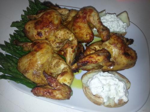 λοιπόν να τα και τα κοκοράκια που ξεκίνησαν για τηγάνι αλλά καταλήξανε στο φούρνο Σαν συνοδευτικό έχει ψητές πατάτες με τυρί κρέμα, σχοινόπρασο και λίγο κρεμμύδι, μαζί με σπαράγγια Για γλυκό κάτι ελαφρύ... Πανακότα με σιρόπι απο βύσσινο και κομμάτια σοκολάτας. Τη προτιμάω μέσα στο ποτήρι πάντως παρά στο πιάτο